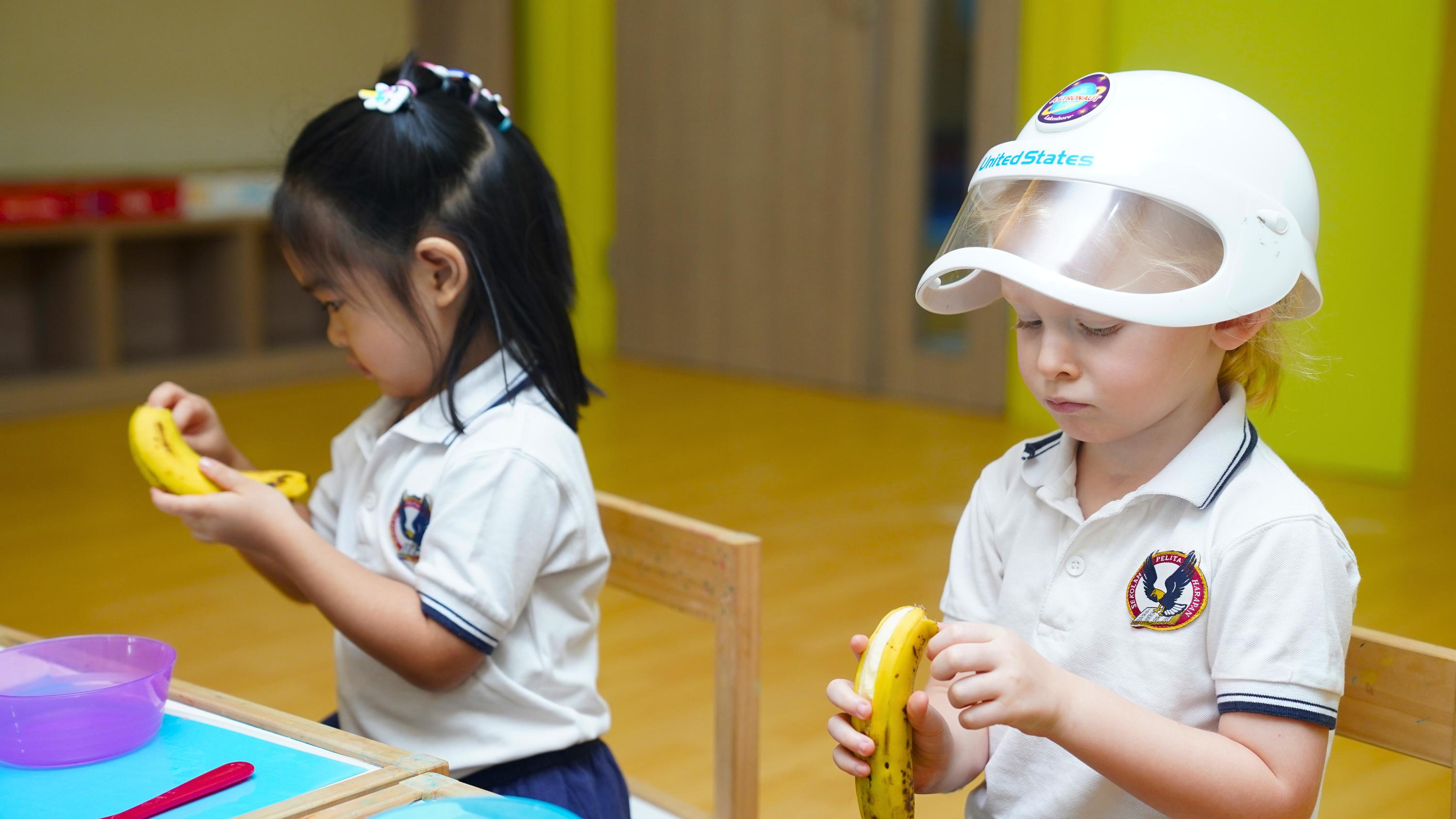Build Pre-Writing Skills: By expertly peeling bananas, our young learners mastered the pincer grasp, enhancing finger control and strengthening hand muscles for future writing success.
