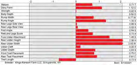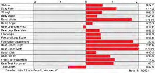 DWP$ +$846 Fat +0.16% +78 Cheese Merit +$785 CDCB-S/HA Genomic Evaluation (04/24) Type +3.43 UDC +2.69 FLC +1.71 BWC +1.13 81%R GTPI +2988 Health and Fertility (04/24) SCS 2.71 79%R MAS +2.0 71%R PL +3.9 77%R LIV -0.7 73%R DPR +0.0 77%R HCR +1.5 76%R CCR +1.7 76%R FI +0.2 77%R SCE 2.7% 90%R WT$ +$87 DCE 1.9% 70%R DSB 3.9% 65%R CW$ +$10 HHP$ +$896 SCR -1.0 93%R