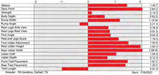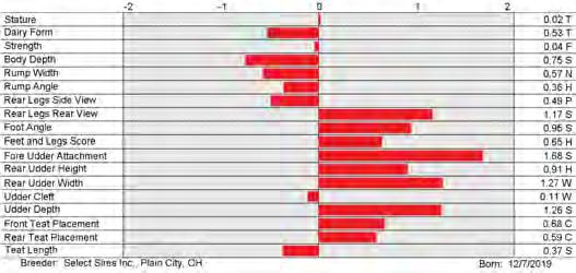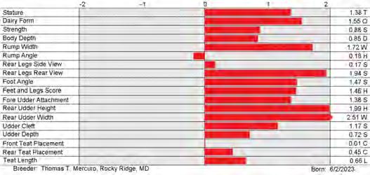 6. Type (PTAT), UDC (Udder Comp.), FLC (Feet & Legs Comp.), BWC (Body Weight Comp.), D (Dairy Capacity Comp.), The higher number is better for all traits.