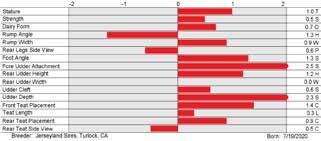 20 gforce sires VOLANT S: JX Cdf Jls Pilgrim THRASHER {6}-ET D: Valsigna Steve 31815 (VG-85%) MGS: Cdf Irwin Steve MGD: Valsigna Perform 27591 (VG-83%) MGGS: Waunakee Legal Perform 14JE2002 VALSIGNA THRASHER VOLANT-ET 8403126987953 BBR 100 JH1C JNSF DMS: 234,345 aAa: 435 B-Casein: A2A2 K-Casein: BB CDCB-S Genomic Evaluation (12/22) Milk +1,180 78%R Net Merit (75%R) +$684 Protein +0.04% +52 Cheese Merit +$694 Fat +0.03% +63 CFP +115 CDCB-S/AJCA Genomic Evaluation (12/22) Type +1.0 80%R +2.9JUI GJPI +158 Health and Fertility (12/22) CDCB/Zoetis Data SCS 2.96 77%R PL +5.3 73%R LIV +2.7 63%R DPR +1.3 72%R HCR +3.0 65%R CCR +2.4 71%R DWP$ +$896 WT$ -$15 CW$ +$98 M FVR 91 37%R MAS -1.3 59%R ZMAS 98 49%R HHP$ +$808 SCR +3.0 50%R JX LAY {6} S: Hilmar Magnus MCCLAIN-ET D: JX Rowleys 1942 Jiggy 2435 {5} (VG-82%) MGS: JX Kash-In Got Jiggy {6}-ET MGD: JX Rowleys 1640 World Cup 1942 {4} (VG-80%) MGGS: JX Co-Op Ad World Cup {4}-ET 14JE2042 JX S-S-I VICTORY MCCLAIN LAY {6}-ET 8403232102316 BBR 100 JH1F JNSF DMS: 561,126 aAa: 534 B-Casein: A2A2 K-Casein: BB CDCB-S Genomic Evaluation (12/22) Milk +683 73%R Net Merit (71%R) +$565 Protein +0.06% +38 Cheese Merit +$576 Fat +0.08% +51 CFP +89 CDCB-S/AJCA Genomic Evaluation (12/22) Type +0.9 78%R +4.3JUI GJPI +125 Health and Fertility (12/22) CDCB/Zoetis Data SCS 2.96 73%R PL +3.0 71%R LIV +1.3 60%R DPR -0.2 69%R HCR +2.3 60%R CCR +0.7 69%R DWP$ +$323 WT$ -$177 CW$ -$66 M FVR 96 35%R MAS -2.1 58%R ZMAS 89 46%R HHP$ +$476 JX BATES {6} S: Jer-Z-Boyz JADYN-ET D: JX Rowleys 1942 Jiggy 2435 {5} (VG-82%) MGS: JX Kash-In Got Jiggy {6}-ET MGD: JX Rowleys 1640 World Cup 1942 {4} (VG-80%) MGGS: JX Co-Op Ad World Cup {4}-ET 14JE2059 JX S-S-I VICTORY JADYN BATES {6}-ET 8403232101695 BBR 100 JH1C JNSF DMS: 234,123 aAa: 513 B-Casein: A2A2 K-Casein: BB CDCB-S Genomic Evaluation (12/22) Milk +1,113 73%R Net Merit (71%R) +$543 Protein +0.05% +52 Cheese Merit +$555 Fat +0.02% +59 CFP +111 CDCB-S/AJCA Genomic Evaluation (12/22) Type +1.3 78%R +0.7JUI GJPI +127 Health and Fertility (12/22) CDCB/Zoetis Data SCS 2.93 73%R PL +2.7 71%R LIV +1.4 60%R DPR -0.8 69%R HCR +2.8 61%R CCR +0.5 69%R DWP$ +$443 WT$ -$184 CW$ -$78 M FVR 91 38%R MAS -2.4 58%R ZMAS 90 48%R HHP$ +$576