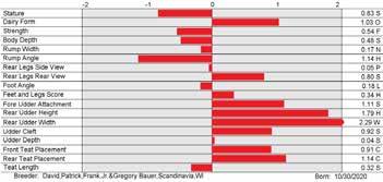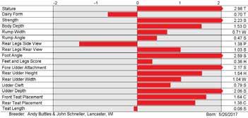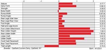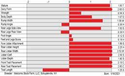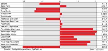 4 7HO15913 WILRA GAMEDAY KAHN-ET 8403231304539 Gameday x Lionel x Achiever 99% RHA-I TR TP TC TV TL TY TD DMS: 345,456 aAa: 342 B-Casein: A2A2 K-Casein: AB CDCB-S Genomic Evaluation (12/22) Milk +1,623 79%R Net Merit (73%R) +$1,185 Protein +0.05% +66 DWP$ +$1,110 Fat +0.19% +120 Cheese Merit +$1,201 CDCB-S/HA Genomic Evaluation (12/22) Type +1.32 UDC +1.42 FLC -0.14 BWC -0.46 79%R GTPI +3101 Health and Fertility (12/22) SCS 2.70 75%R MAS +1.7 70%R PL +6.3 74%R LIV +1.5 70%R DPR -0.9 74%R HCR +3.3 72%R CCR +2.1 74%R FI +0.0 74%R SCE 2.4% 63%R WT$ -$38 DCE 2.8% 57%R DSB 4.5% 55%R CW$ -$67 HHP$ +$1,188 7HO16276 OCD TROOPER SHEEPSTER-ET 8403236792832 Trooper x Acura x Resolve 99% RHA-I TR TP TC TV TL TY TD DMS: 135,123 aAa: 342 B-Casein: A1A2 K-Casein: AA CDCB-S Genomic Evaluation (12/22) Milk +1,251 80%R Net Merit (73%R) +$1,188 Protein +0.11% +71 DWP$ +$1,288 Fat +0.26% +124 Cheese Merit +$1,210 CDCB-S/HA Genomic Evaluation (12/22) Type +1.32 UDC +1.10 FLC +0.67 BWC -0.26 78%R GTPI +3162 Health and Fertility (12/22) SCS 2.84 75%R MAS +3.3 70%R PL +6.2 74%R LIV +3.2 70%R DPR -0.3 74%R HCR +1.8 71%R CCR +1.8 73%R FI +0.5 73%R SCE 2.6% 63%R WT$ +$93 DCE 2.7% 57%R DSB 5.3% 54%R CW$ +$4 HHP$ +$1,299 14HO16072 OCD GAMEDAY DETROIT-ET 8403221358624 Gameday x Option x Bandares 99% RHA-I TR TP TC TV TL TY TD DMS: 135,561 aAa: 342 B-Casein: A1A2 K-Casein: AA CDCB-S Genomic Evaluation (12/22) Milk +537 80%R Net Merit (73%R) +$1,157 Protein +0.08% +40 DWP$ +$1,147 Fat +0.27% +98 Cheese Merit +$1,179 CDCB-S/HA Genomic Evaluation (12/22) Type +1.23 UDC +1.92 FLC +0.33 BWC -1.44 78%R GTPI +3070 Health and Fertility (12/22) SCS 2.60 75%R MAS +3.9 69%R PL +7.1 74%R LIV +2.8 70%R DPR +2.0 73%R HCR +3.5 72%R CCR +3.8 73%R FI +2.6 73%R SCE 1.7% 62%R WT$+$117 DCE 1.9% 56%R DSB 4.3% 53%R CW$ -$16 HHP$ +$1,132