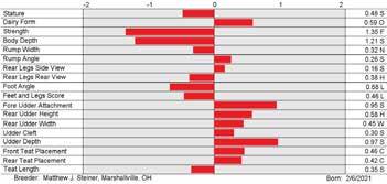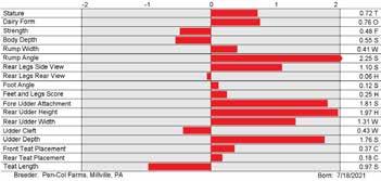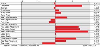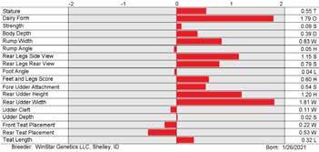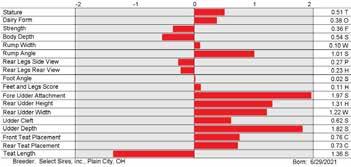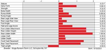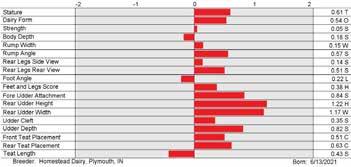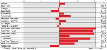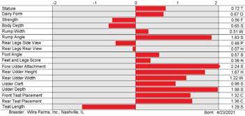 6 7HO15821 T-SPRUCE G FROST BITE-ET 8403220234128 Granada x Lionel x Samuri 99% RHA-I TR TP TC TV TL TY TD DMS: 345,135 aAa: 534 B-Casein: A2A2 K-Casein: AB CDCB-S Genomic Evaluation (12/22) Milk +1,700 80%R Net Merit (74%R) +$1,242 Protein +0.06% +70 DWP$ +$1,414 Fat +0.14% +106 Cheese Merit +$1,257 CDCB-S/HA Genomic Evaluation (12/22) Type +0.07 UDC +0.80 FLC -0.20 BWC -1.64 78%R GTPI +3055 Health and Fertility (12/22) SCS 2.78 75%R MAS +1.2 70%R PL +6.5 74%R LIV +1.9 71%R DPR +0.5 74%R HCR +4.3 73%R CCR +2.7 74%R FI +1.8 74%R SCE 1.9% 88%R WT$+$173 DCE 2.1% 71%R DSB 4.4% 65%R CW$ -$21 HHP$ +$1,157 SCR -1.3 75%R 14HO16011 LEVEL-PLAIN VERSACHI-ET 8403208694575 Supercharge x Acura x Achiever 99% RHA-I TR TP TC TV TL TY TD DMS: 345,234 aAa: 435 B-Casein: A2A2 K-Casein: AB CDCB-S Genomic Evaluation (12/22) Milk +1,507 80%R Net Merit (73%R) +$1,191 Protein +0.04% +59 DWP$ +$1,173 Fat +0.18% +110 Cheese Merit +$1,201 CDCB-S/HA Genomic Evaluation (12/22) Type +1.31 UDC +1.60 FLC +0.75 BWC -1.31 78%R GTPI +3084 Health and Fertility (12/22) SCS 2.88 76%R MAS +3.3 70%R PL +6.8 74%R LIV +5.2 71%R DPR -0.8 74%R HCR +2.5 72%R CCR +1.4 74%R FI +0.0 74%R SCE 1.7% 63%R WT$ +$42 DCE 2.4% 57%R DSB 4.6% 55%R CW$ -$8 HHP$ +$1,167 7HO16067 WILRA SSI REGAL ENCLAVE-ET 8403241466104 Regal x Legacy x Spectre 99% RHA-I TR TP TC TV TL TY TD DMS: 234,123 aAa: 432 B-Casein: A2A2 K-Casein: BB CDCB-S Genomic Evaluation (12/22) Milk +1,009 79%R Net Merit (72%R) +$1,021 Protein +0.08% +54 DWP$ +$1,127 Fat +0.17% +89 Cheese Merit +$1,043 CDCB-S/HA Genomic Evaluation (12/22) Type +1.20 UDC +1.76 FLC -0.07 BWC +0.00 78%R GTPI +2998 Health and Fertility (12/22) SCS 2.58 75%R MAS +4.1 70%R PL +7.3 74%R LIV +3.0 70%R DPR +0.3 73%R HCR +2.2 71%R CCR +1.5 73%R FI +0.9 73%R SCE 1.4% 62%R WT$+$173 DCE 1.6% 57%R DSB 4.5% 54%R CW$ -$2 HHP$ +$1,142