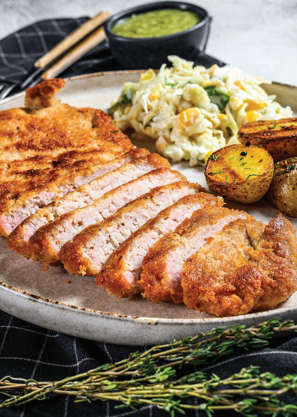 Nduja-Stuffed & Breaded Pork Tomahawk Chop with Spring Slaw and Roasted Potato & Pickle Salad