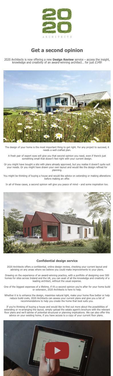 A cost effective, direct route to market via the most trusted path for self-builders, extenders and renovators across Ireland. 028 9751 0570 (048 from ROI) enquire@selfbuild.ie Cost £1,100 / €1,300 per email 75,000+