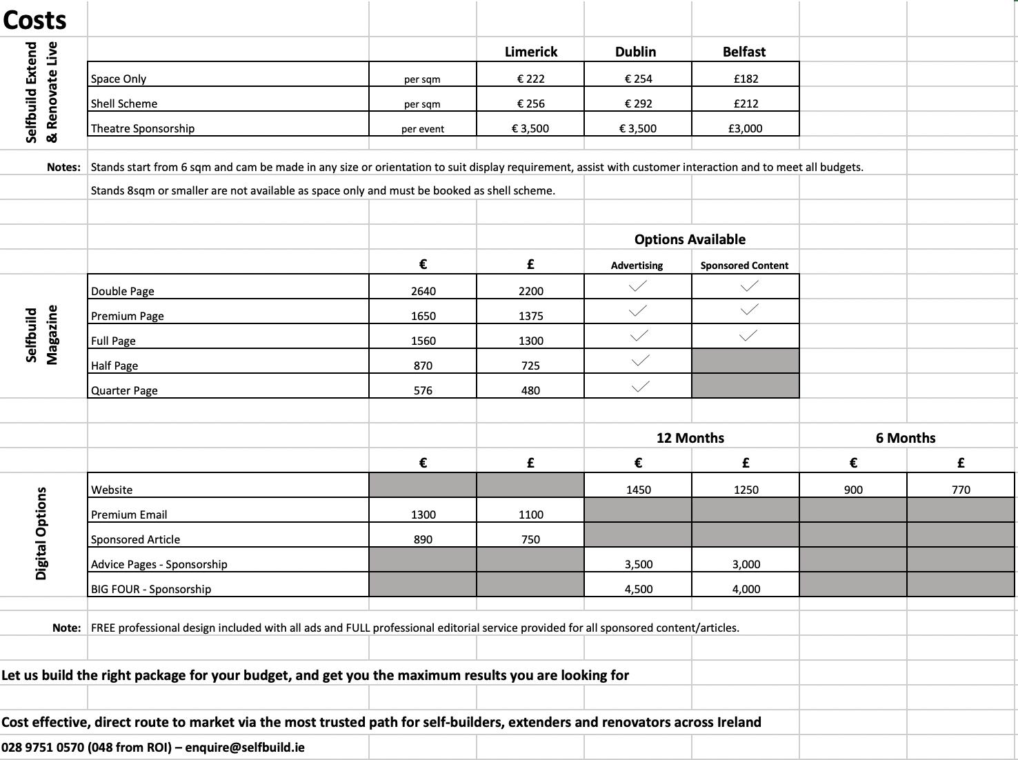 A cost effective, direct route to market via the most trusted path for self-builders, extenders and renovators across Ireland. 028 9751 0570 (048 from ROI) enquire@selfbuild.ie Cost £3,000 / €3,500 per theatre per event LIMERICK January DUBLIN May BELFAST September &
