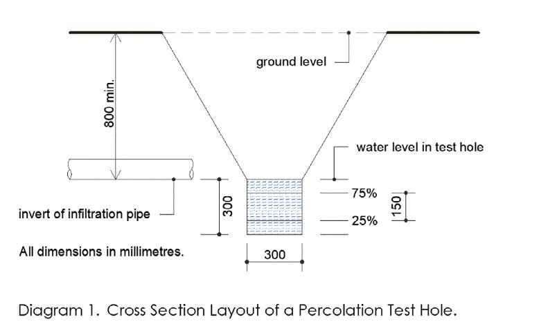 Excavate at least two holes (preferably three), each 300mm square with a depth at least 300mm below the proposed invert level (i.e. the bottom) of the infiltration pipe (see diagram on the right) and space them evenly along the proposed line of the subsurface irrigation system. Fill each hole with water to a depth of at least 300mm and allow this to seep away completely. If the water drains rapidly (within 10 minutes) the