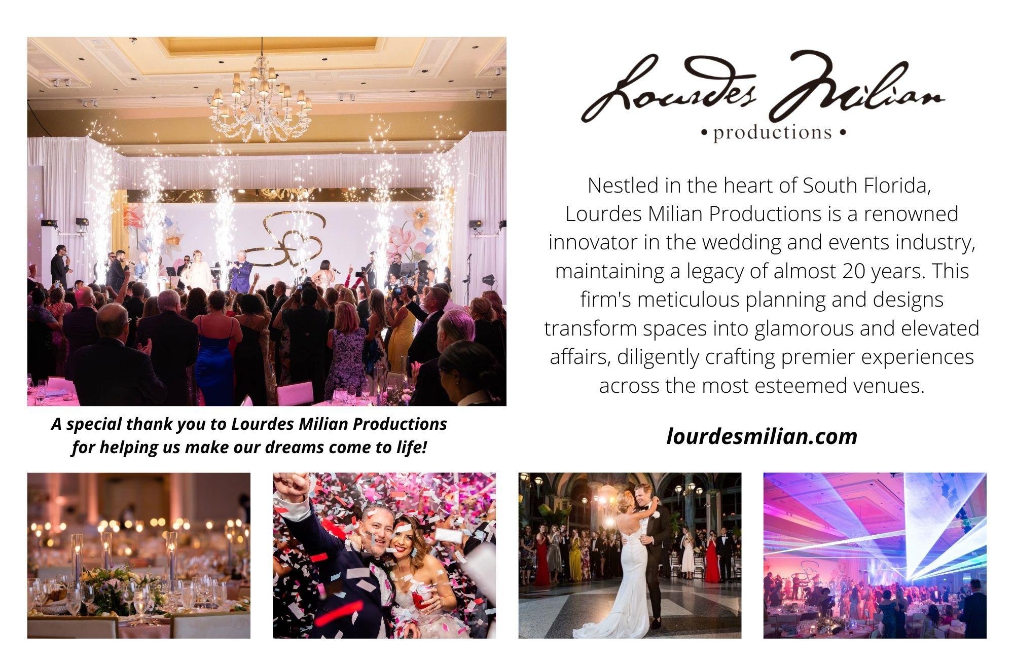 Nestled in the heart of South Florida, Lourdes Milian Productions is a renowned innovator in the wedding and events industry, maintaining a legacy of over 20 years. This firm’s meticulous planning and designs transform spaces into glamorous and elevated affairs, diligently crafting premier experiences across the most esteemed venues.