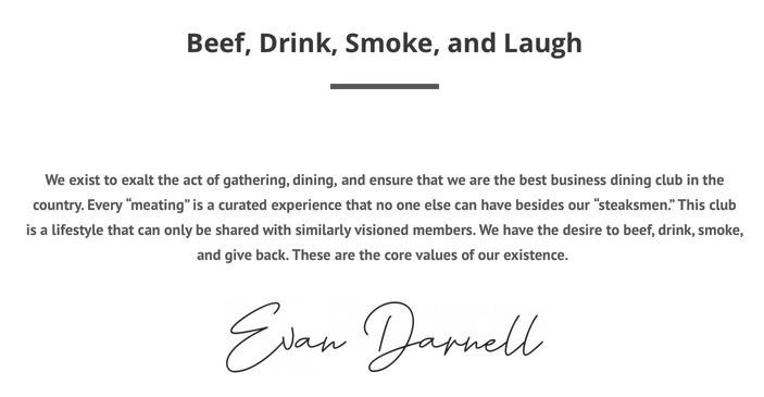 We exist to exalt the act of gathering, and dining, and ensure that we are the best business dining club in the country. Every “meat-ing” is a curated experience that is only available to our “steaks men.” Our lifestyle club brings together people who share a desire to indulge in beef, drink, smoke, and give back. These are the core values of our existence.