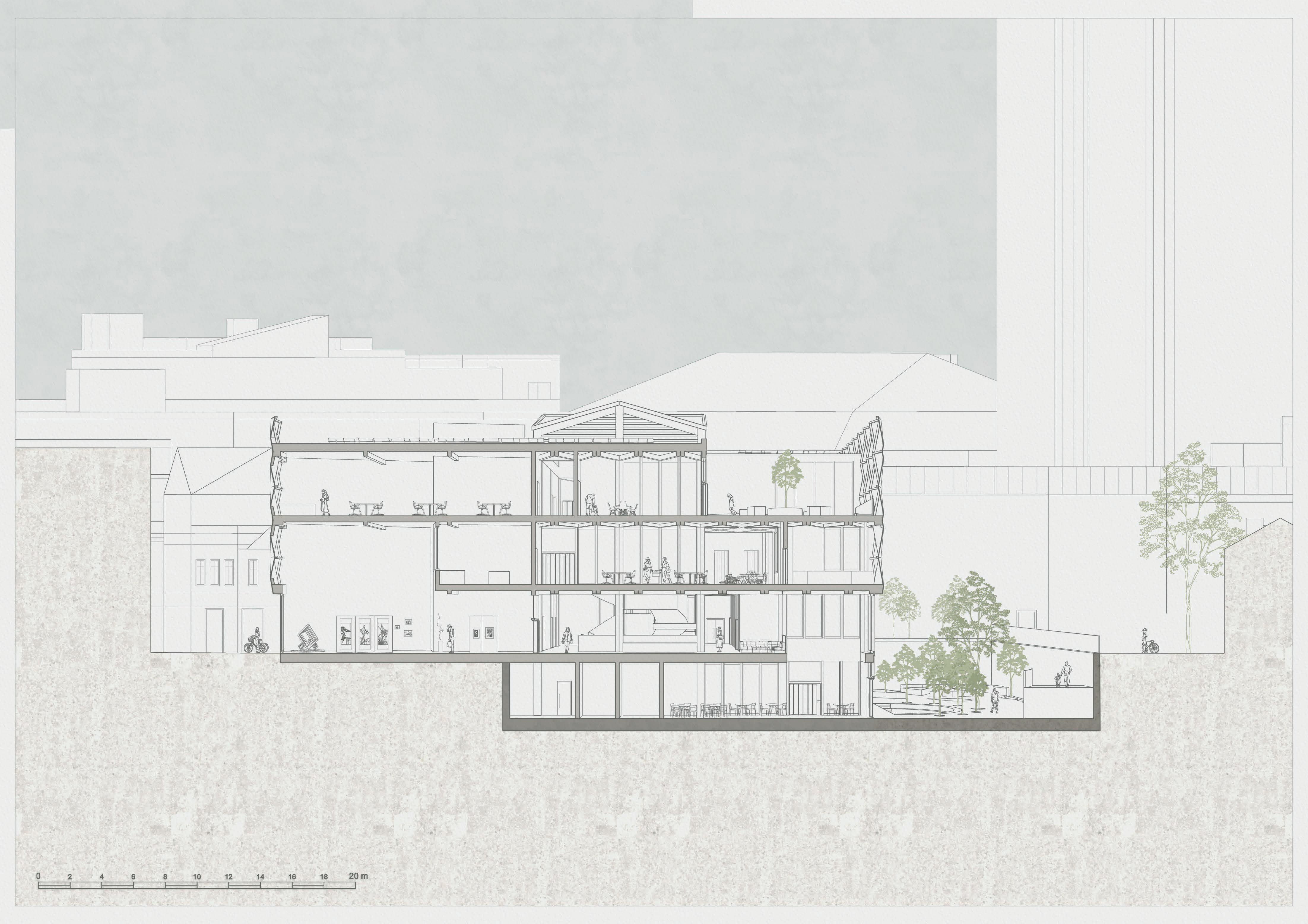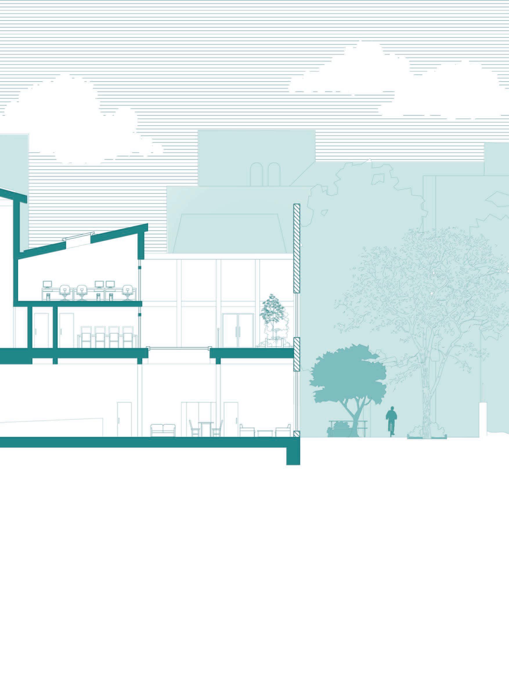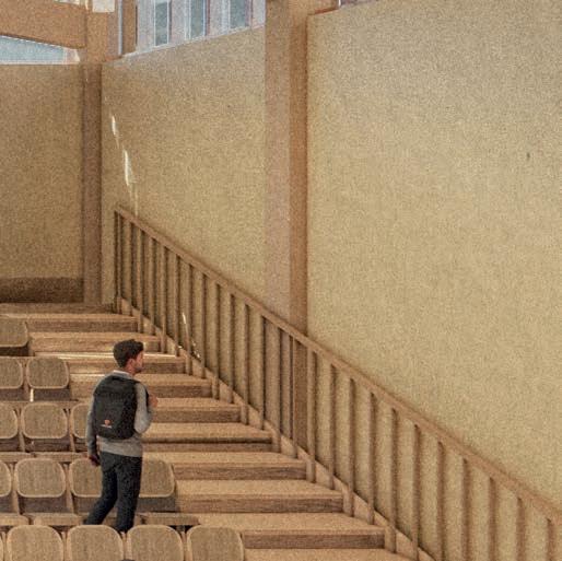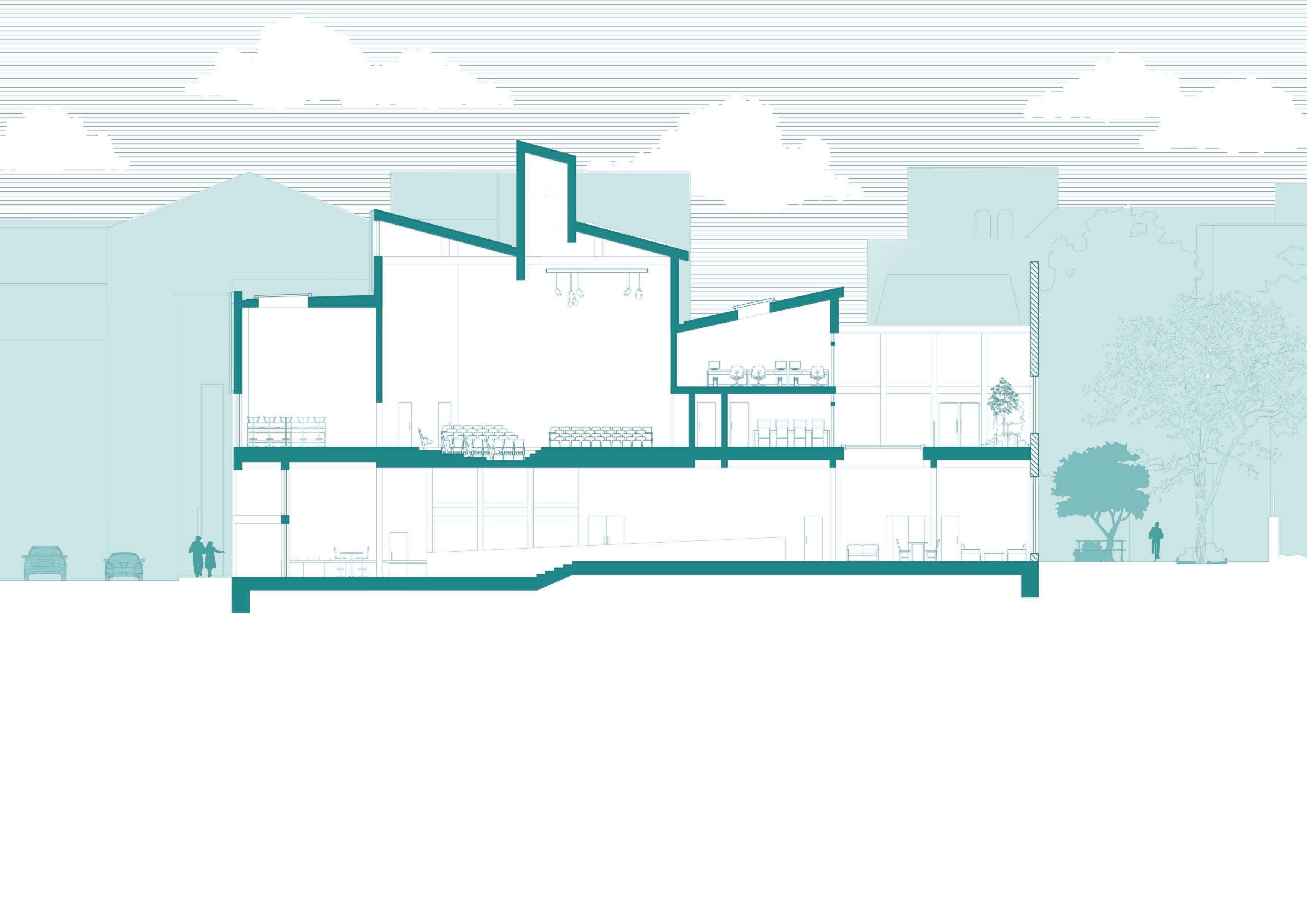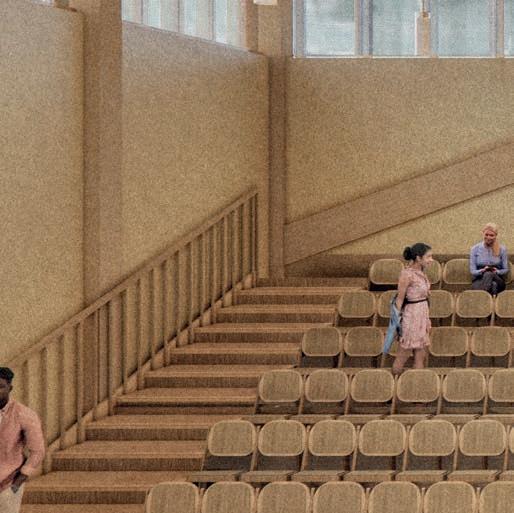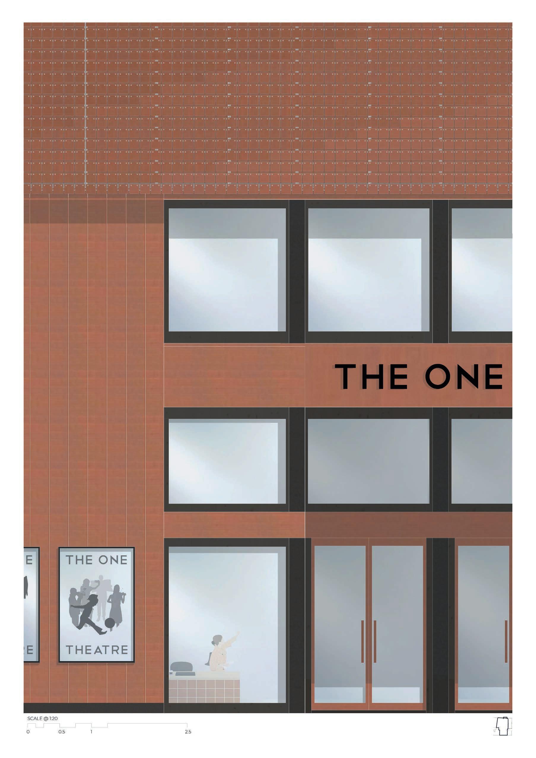 The building simultaneously acts as a community hub with the provision of a film and theatre workshop spaces. Public access to these facilities and classes enables more opportunities for people to get involved with the film and theatre industry. This in turn encourages representation. Creating an environment which focuses on community helps to foster connections between people. The theatre will boost individuals’ sense of belonging, encouraging unity among the residents of Oxford. The workshop, public amenities and intercultural theatre are combined under one roof to become architecture that is of, and for, the people of Oxford. The site is bordered by two busy streets. The design addresses these two frontages by treating the ground floor as an extension of the external street both in the north and the south. The stone façade of the existing south elevation will be preserved due to it being a Grade I listed building. The notional floor levels of the Georgian stone exterior are used as a guide for the internal floor heights. Existing masonry is paired with a copper roof which is inspired by vernacular architecture of Oxford which features many patinated copper roofs. The patinated copper roof stretches across the building and is met with copper standing seam cladding. The variation in copper’s aging is an expression of the existing masonry being integrated with the new-build in the north of the site.