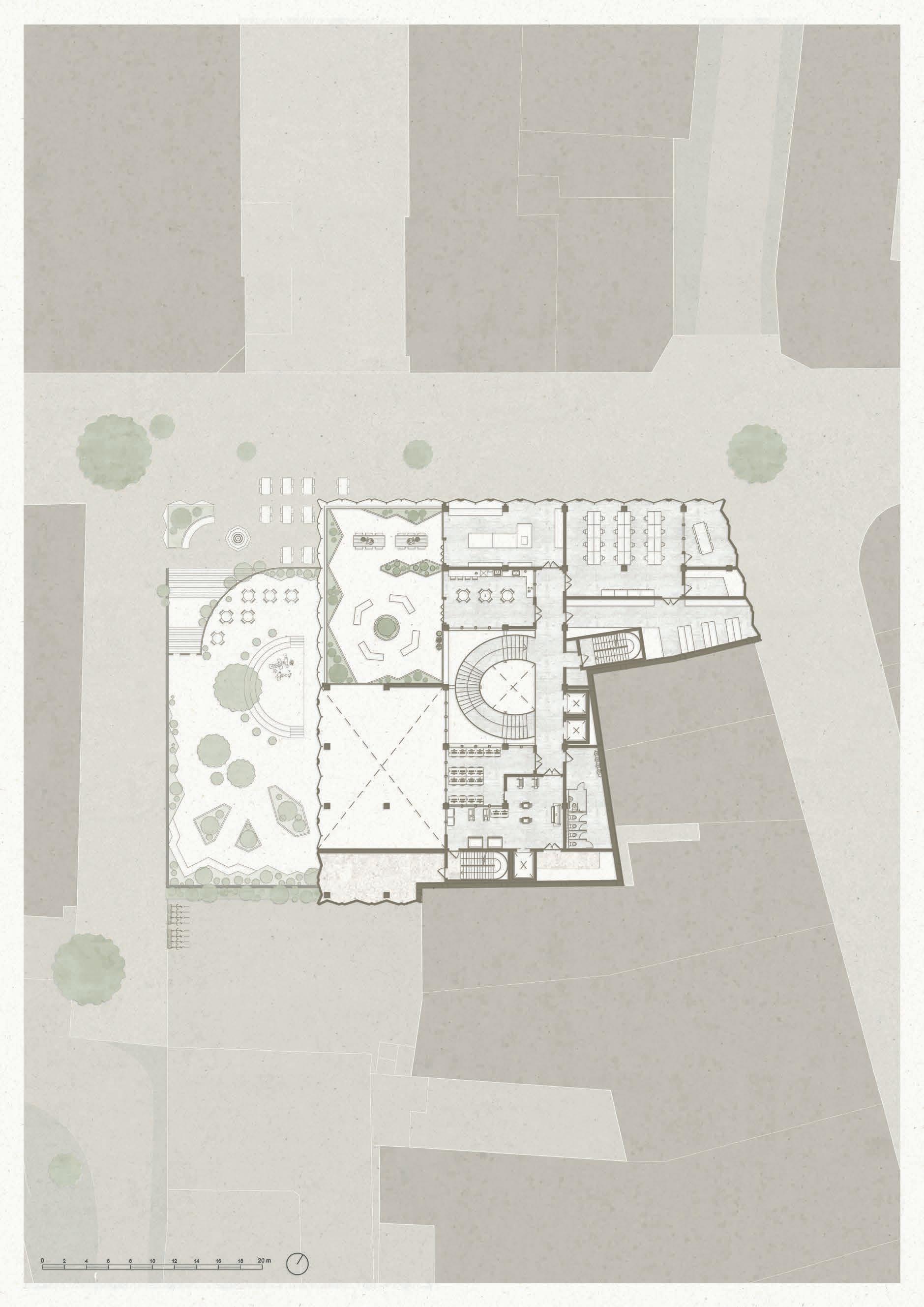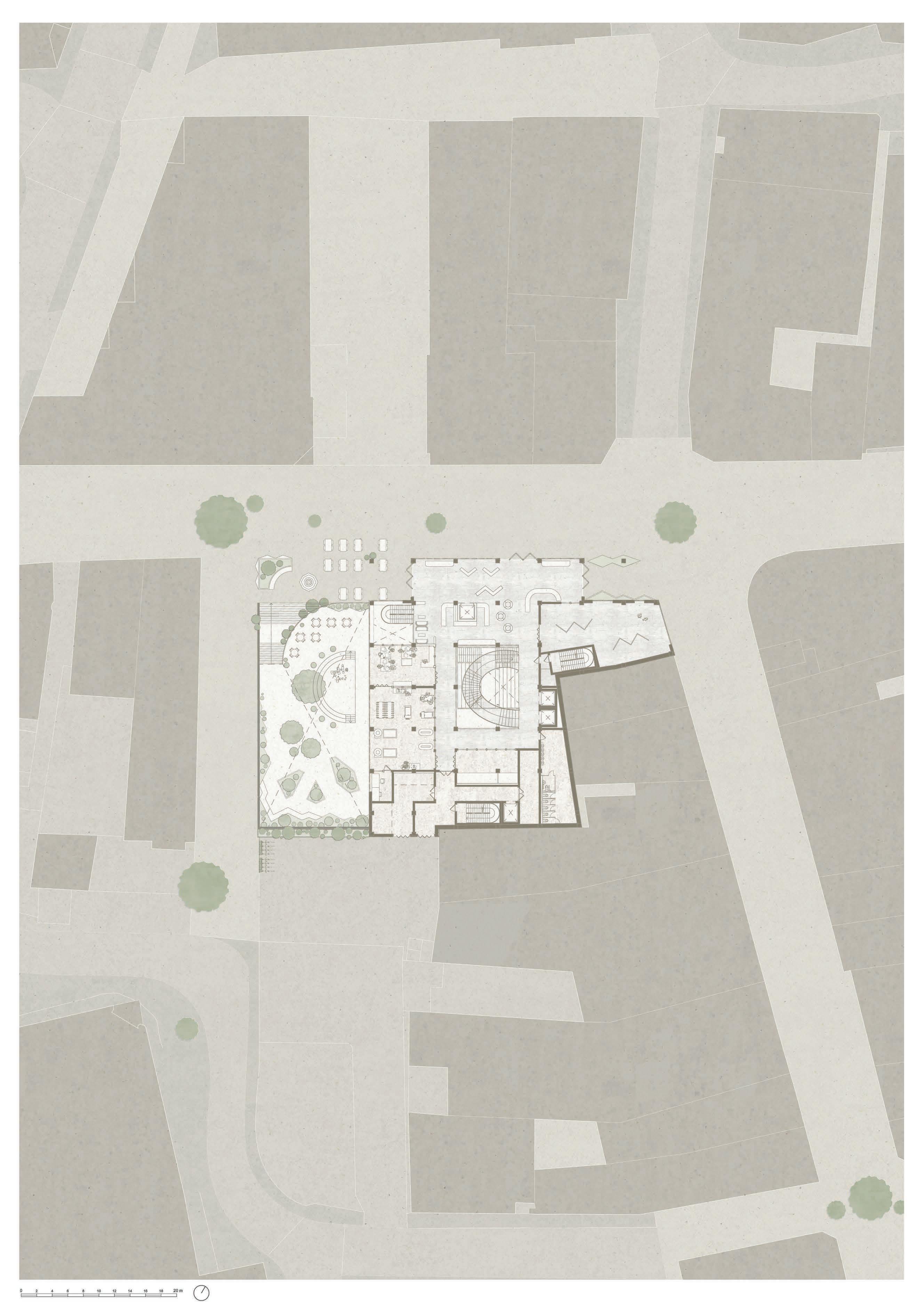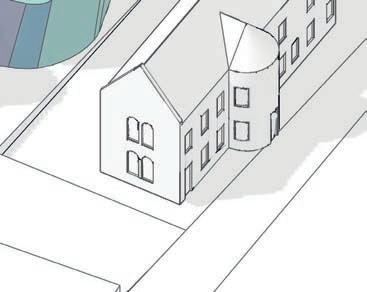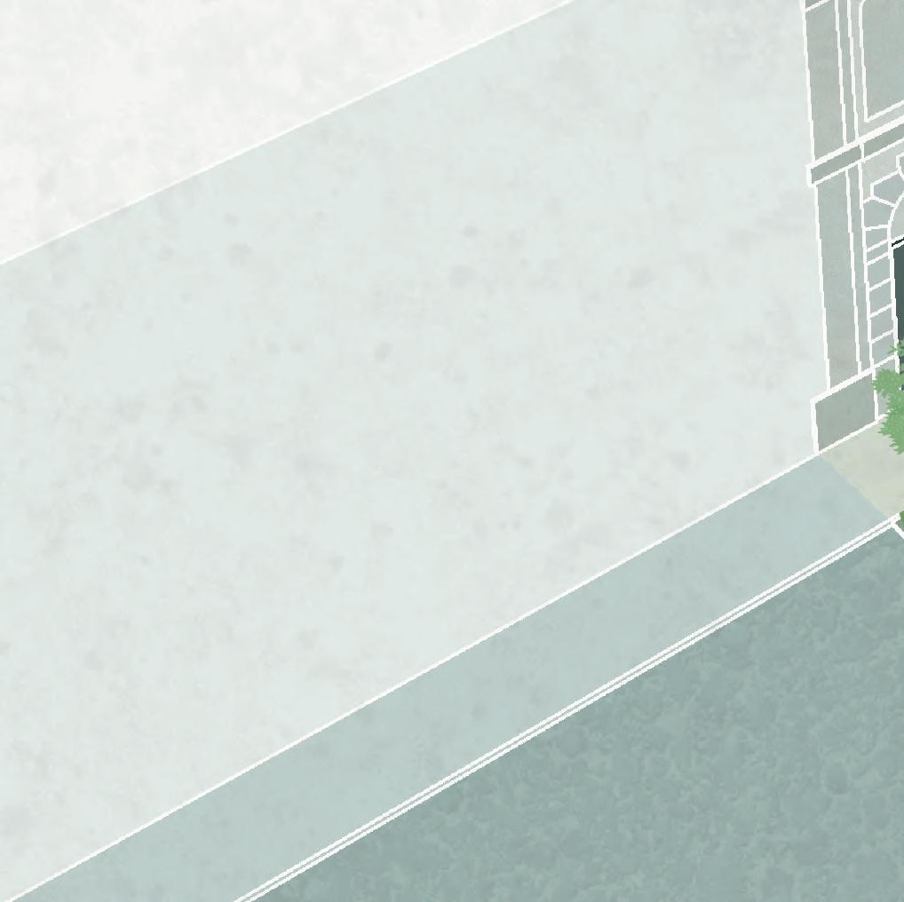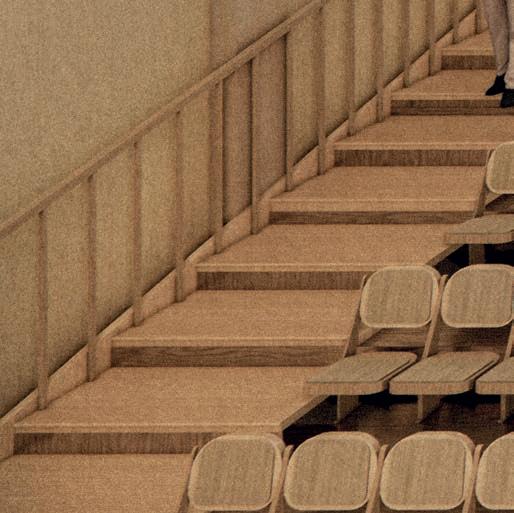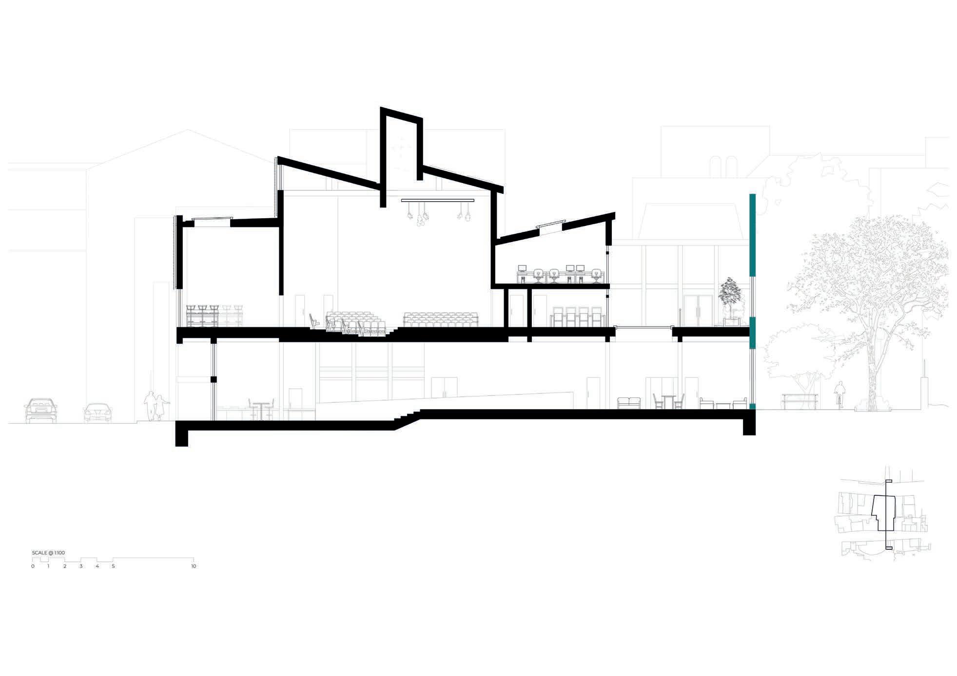 The building simultaneously acts as a community hub with the provision of a film and theatre workshop spaces. Public access to these facilities and classes enables more opportunities for people to get involved with the film and theatre industry. This in turn encourages representation. Creating an environment which focuses on community helps to foster connections between people. The theatre will boost individuals’ sense of belonging, encouraging unity among the residents of Oxford. The workshop, public amenities and intercultural theatre are combined under one roof to become architecture that is of, and for, the people of Oxford. The site is bordered by two busy streets. The design addresses these two frontages by treating the ground floor as an extension of the external street both in the north and the south. The stone façade of the existing south elevation will be preserved due to it being a Grade I listed building. The notional floor levels of the Georgian stone exterior are used as a guide for the internal floor heights. Existing masonry is paired with a copper roof which is inspired by vernacular architecture of Oxford which features many patinated copper roofs. The patinated copper roof stretches across the building and is met with copper standing seam cladding. The variation in copper’s aging is an expression of the existing masonry being integrated with the new-build in the north of the site.