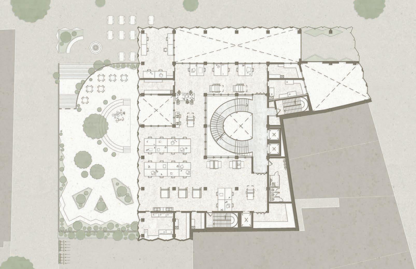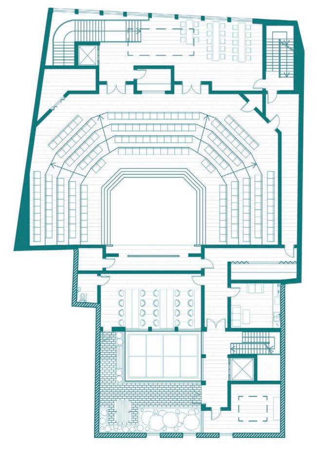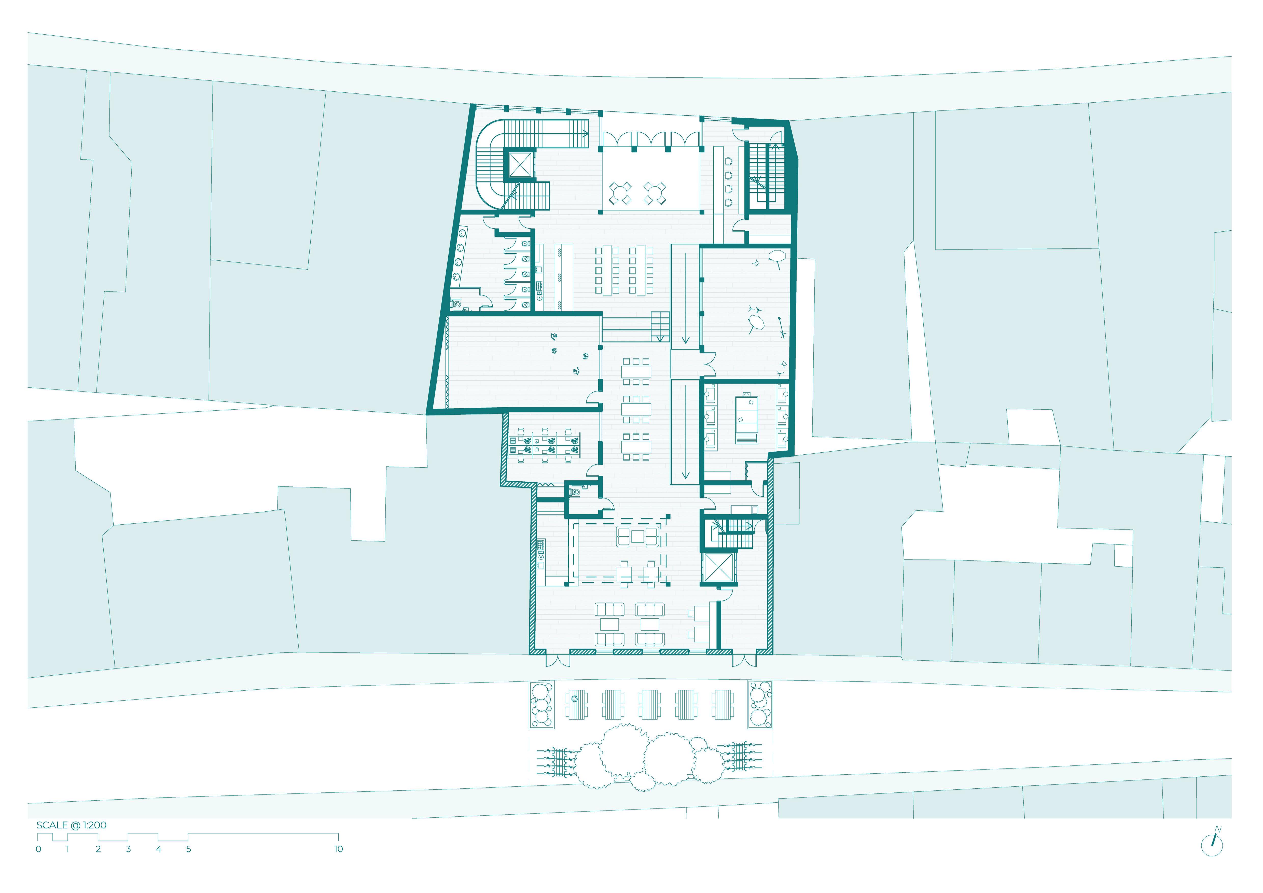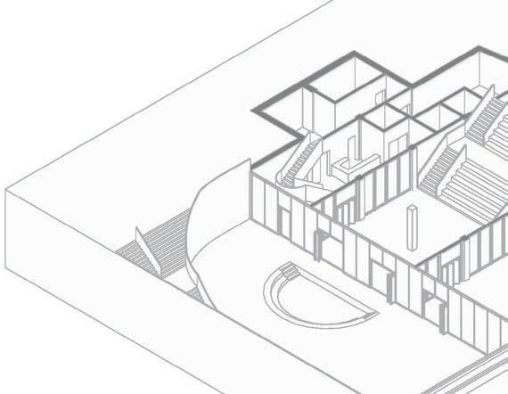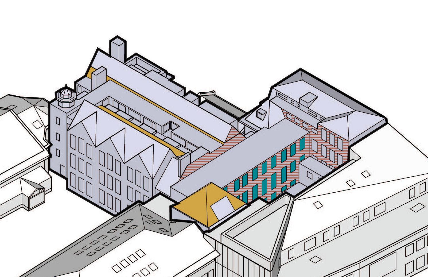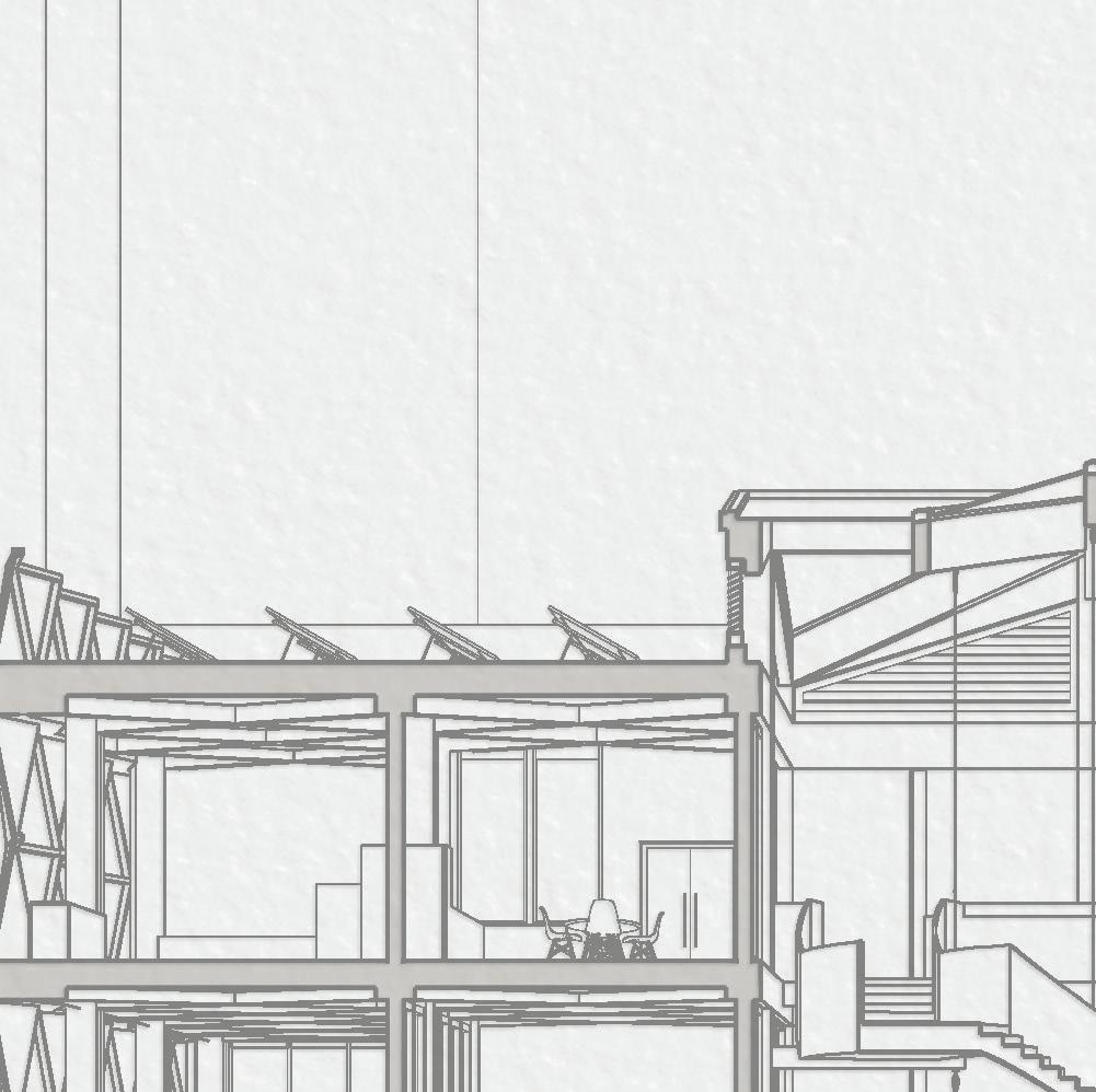 The building simultaneously acts as a community hub with the provision of a film and theatre workshop spaces. Public access to these facilities and classes enables more opportunities for people to get involved with the film and theatre industry. This in turn encourages representation. Creating an environment which focuses on community helps to foster connections between people. The theatre will boost individuals’ sense of belonging, encouraging unity among the residents of Oxford. The workshop, public amenities and intercultural theatre are combined under one roof to become architecture that is of, and for, the people of Oxford. The site is bordered by two busy streets. The design addresses these two frontages by treating the ground floor as an extension of the external street both in the north and the south. The stone façade of the existing south elevation will be preserved due to it being a Grade I listed building. The notional floor levels of the Georgian stone exterior are used as a guide for the internal floor heights. Existing masonry is paired with a copper roof which is inspired by vernacular architecture of Oxford which features many patinated copper roofs. The patinated copper roof stretches across the building and is met with copper standing seam cladding. The variation in copper’s aging is an expression of the existing masonry being integrated with the new-build in the north of the site.