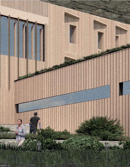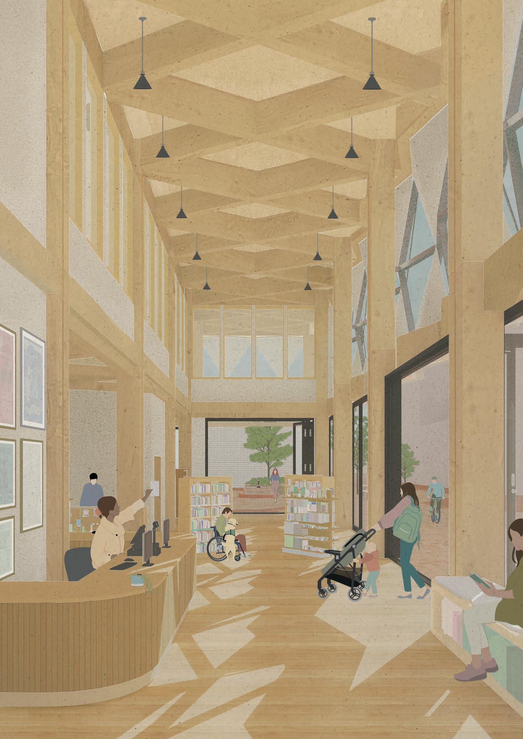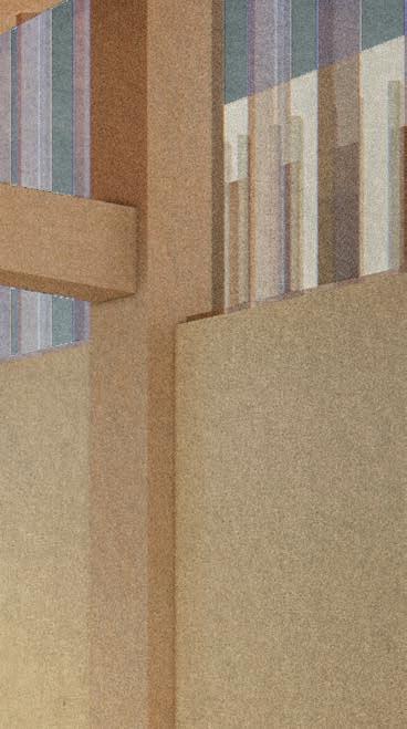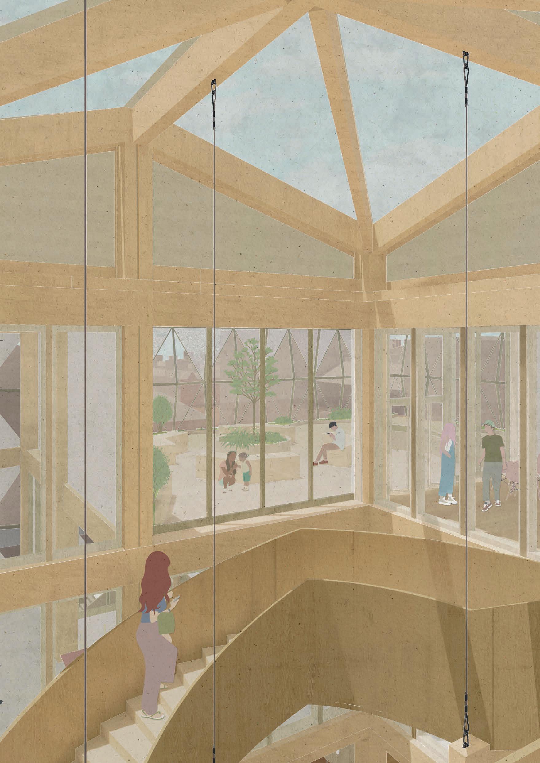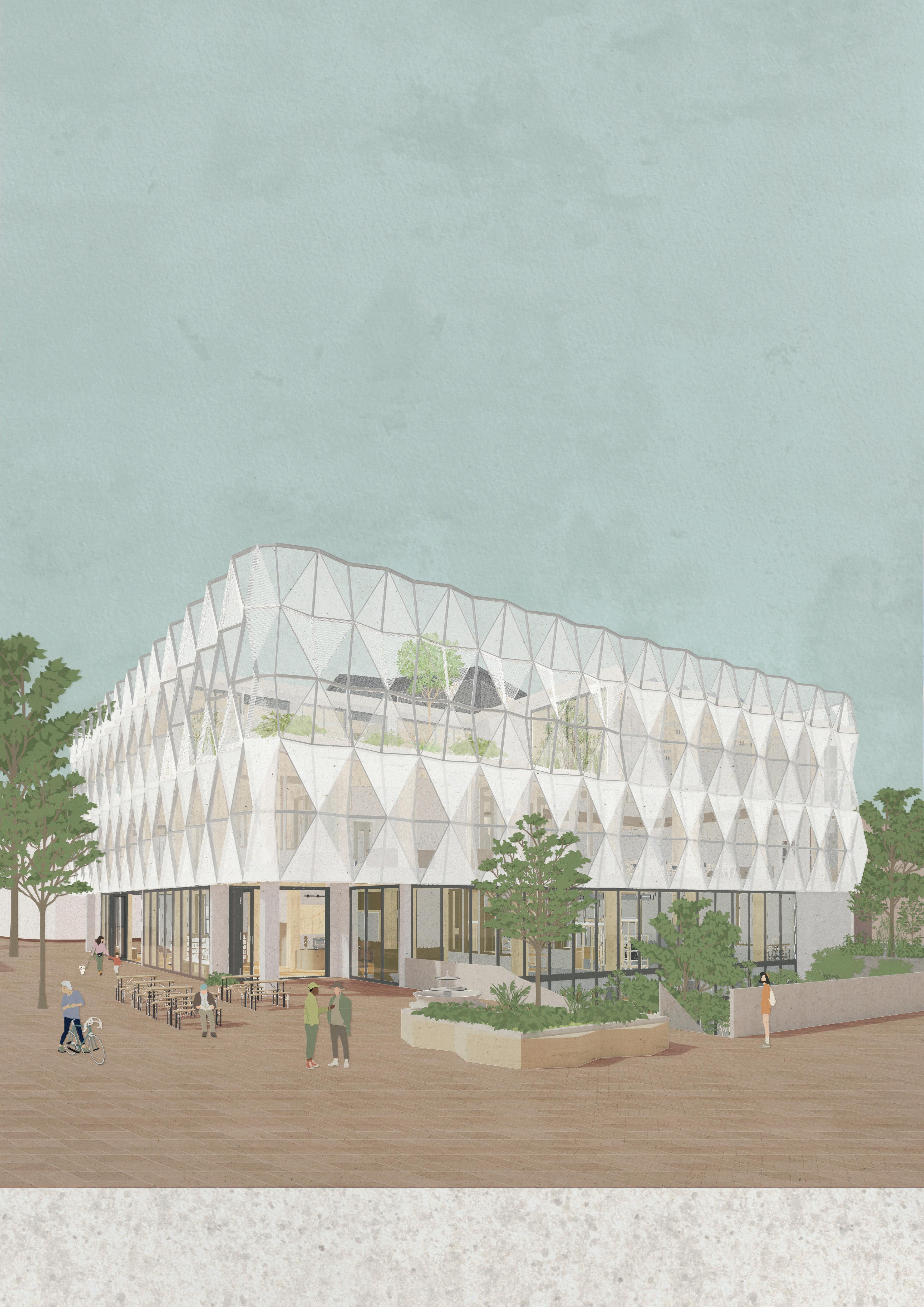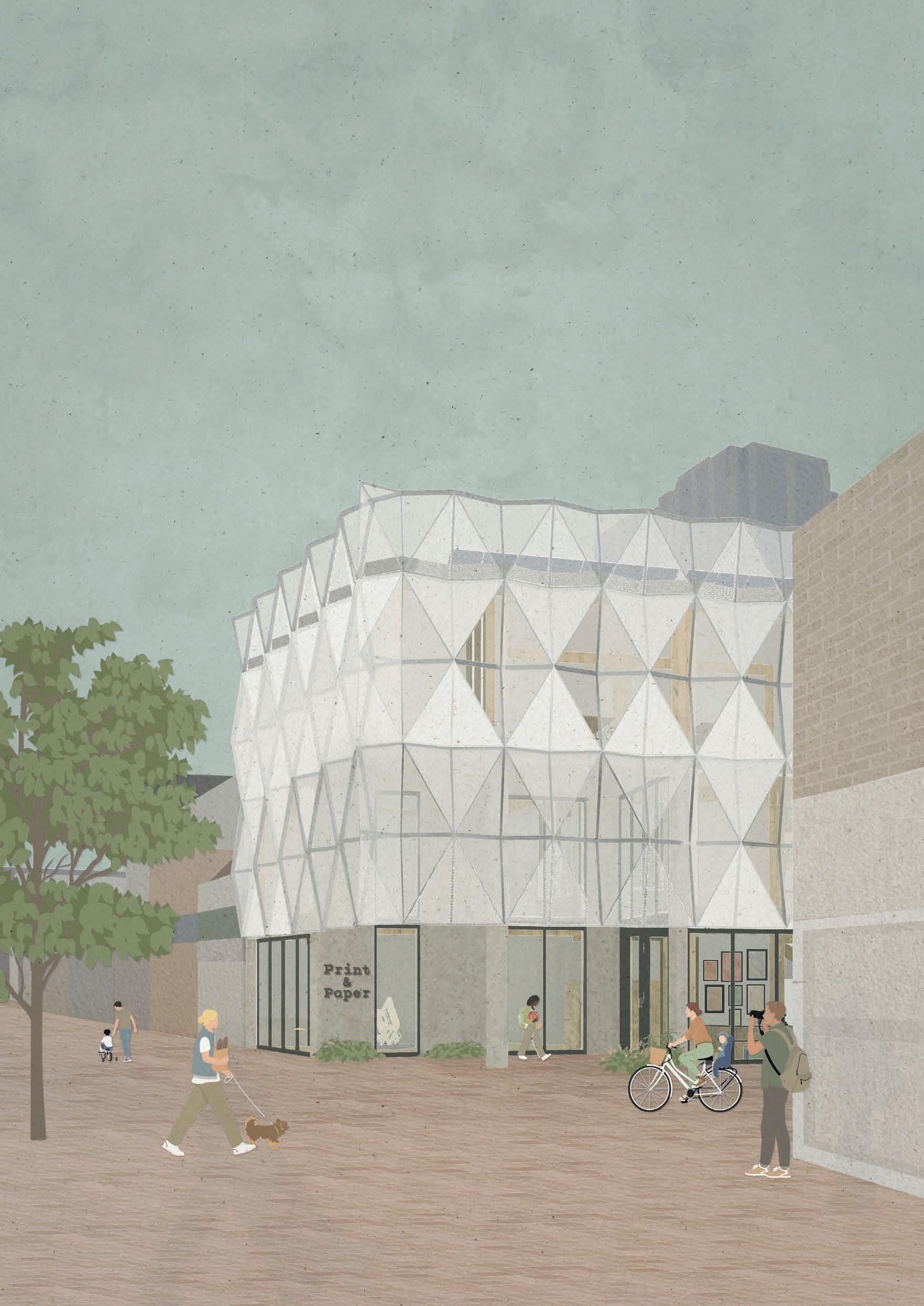 The project hopes to breathe new life into the local community by proposing open-access workshops dedicated to the traditional craft techniques of print and papermaking. These workshops will serve as a hub for creativity and sustainability and a symbol of future growth. Accessible to all, the building will encourage artistic exploration, learning, and skill development. The program fosters sustainability by reusing the existing basement structure and integrating an outreach program using Swindon’s waste paper for hand-crafting. The reuse of the previous building’s concrete basement promotes refurbishment as a way to reduce carbon emissions. The approach also presents the opportunity to showcase the interplay between Swindon’s past and present. Inspired by origami, the folding façade pays homage to papercraft while embodying the functions and purpose of the building. This narrative is consistent throughout the design, with structural features leaning into the idea of folding and paper’s transformative qualities. Exploring the material theme further, visitors are taken on a journey through the building as each floor represents a part of paper’s story and life cycle.
