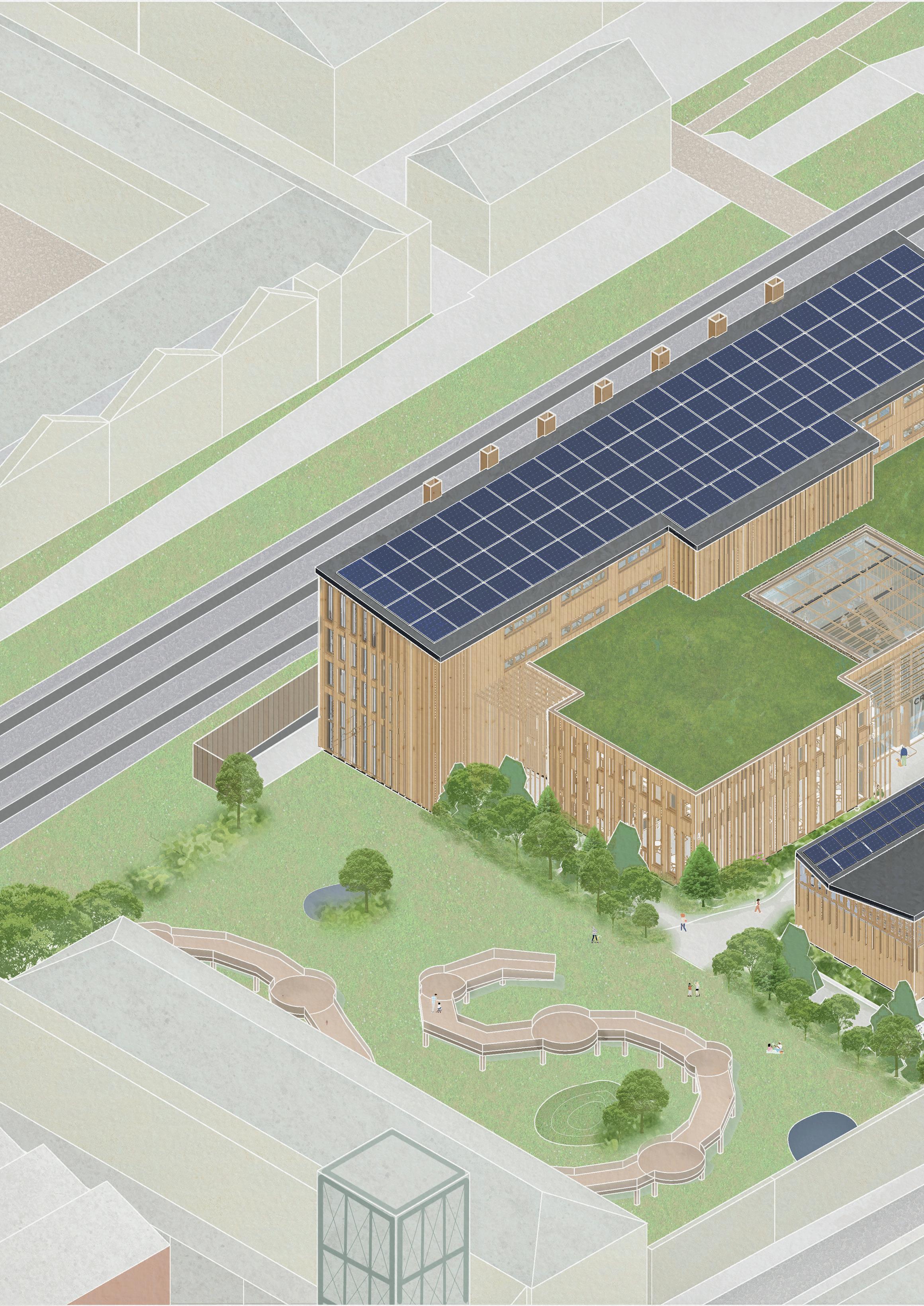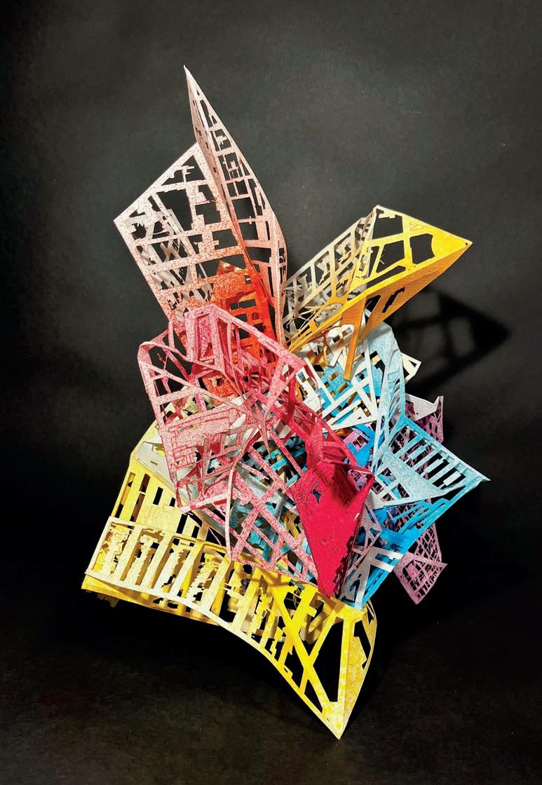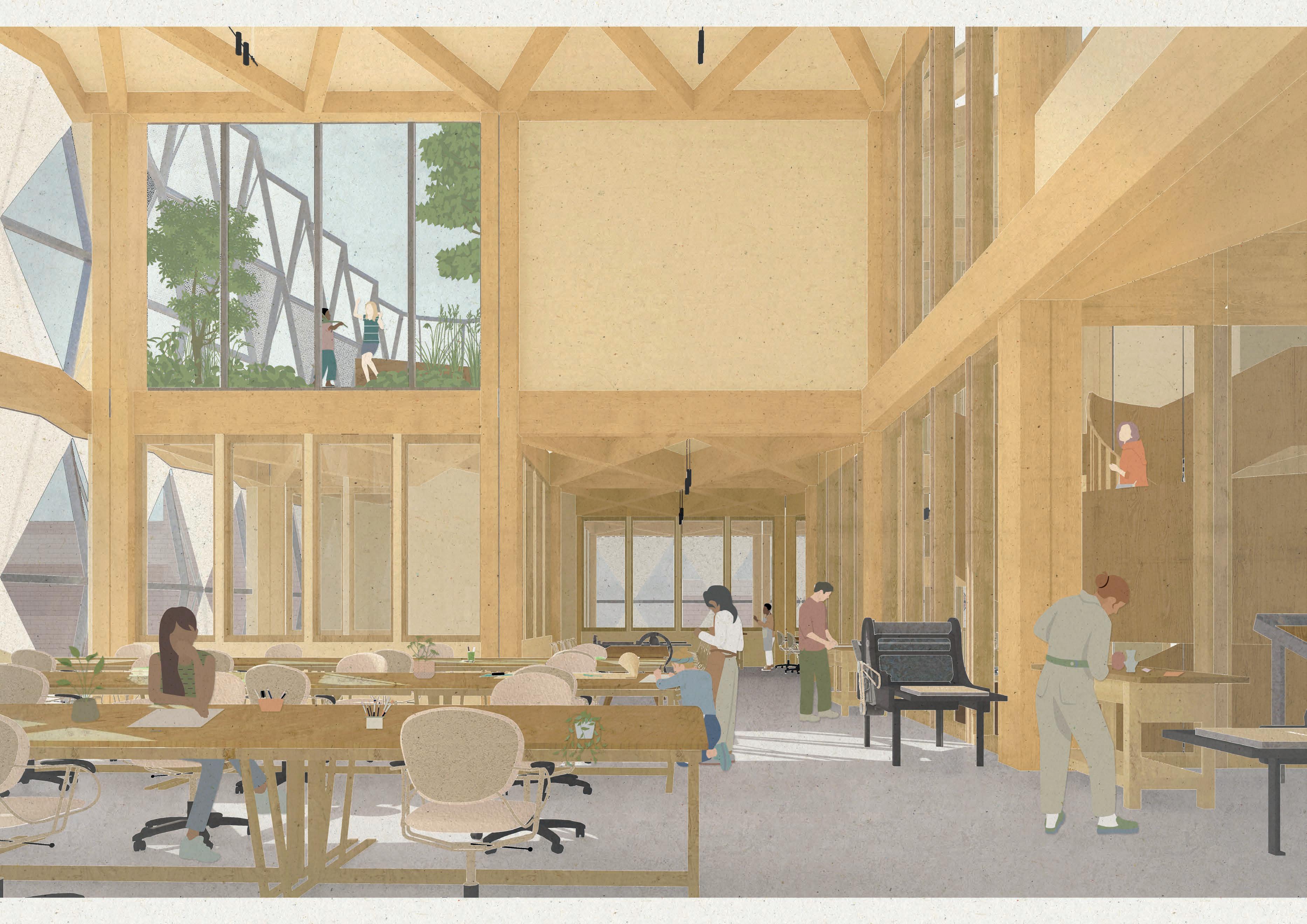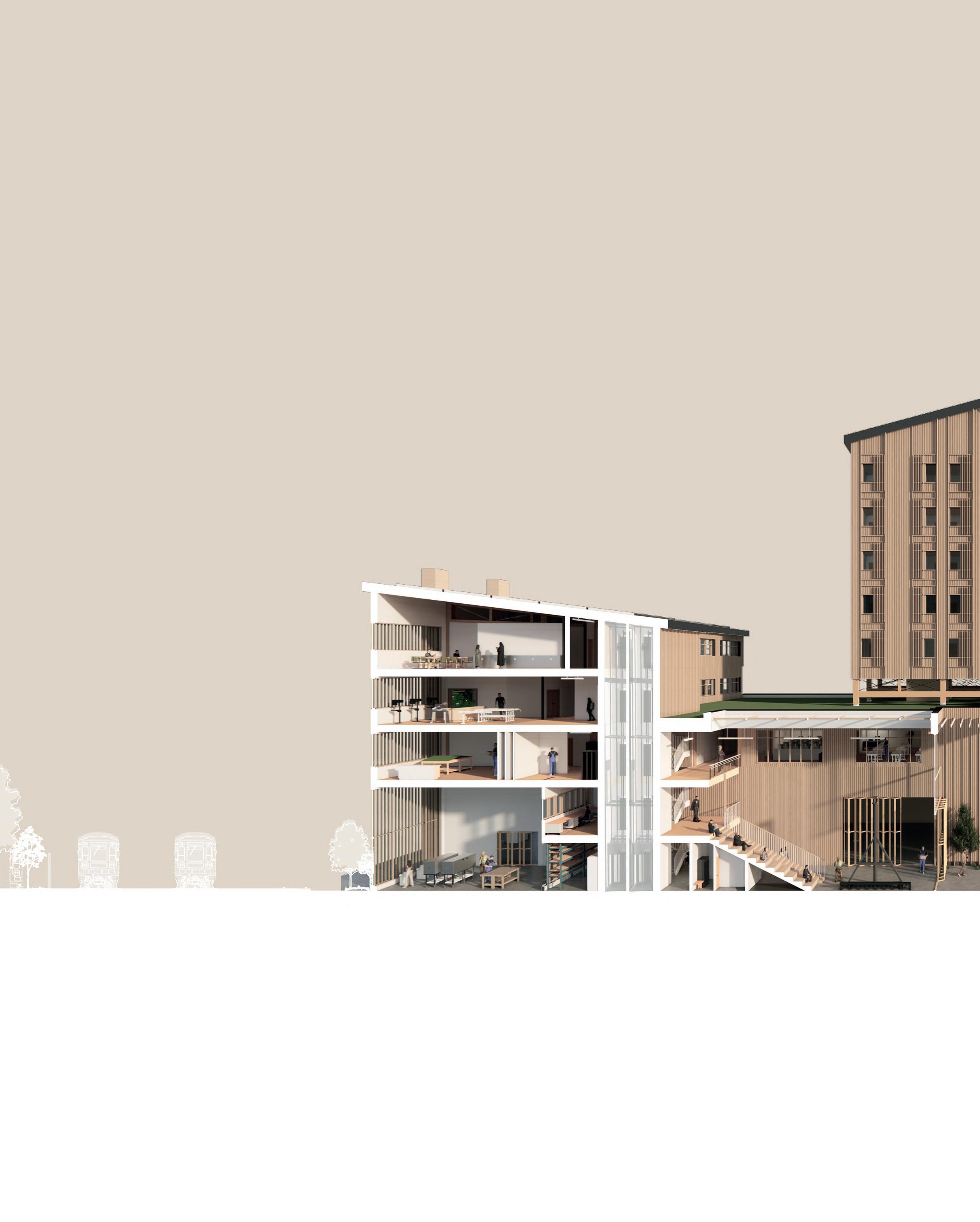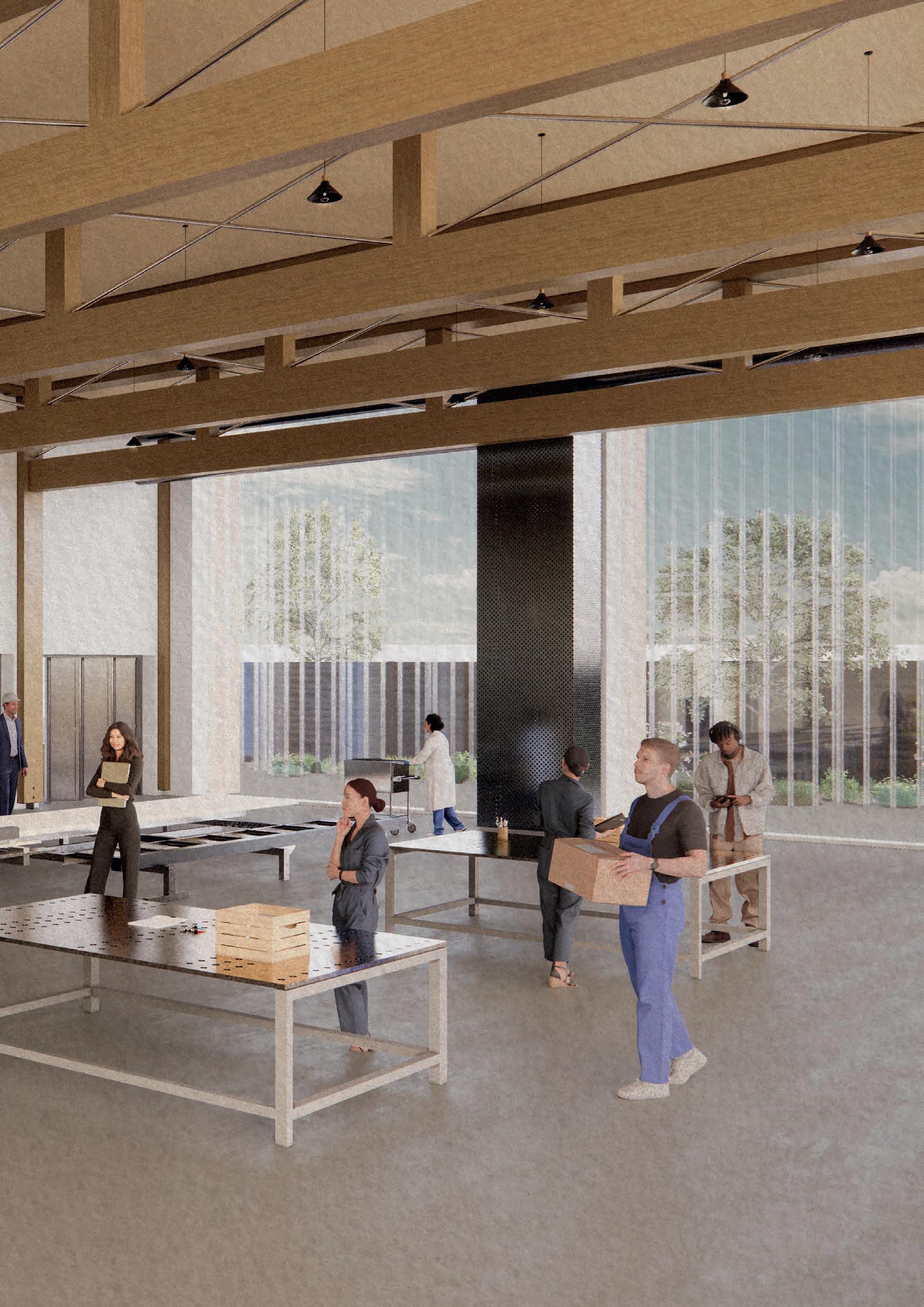 The project hopes to breathe new life into the local community by proposing open-access workshops dedicated to the traditional craft techniques of print and papermaking. These workshops will serve as a hub for creativity and sustainability and a symbol of future growth. Accessible to all, the building will encourage artistic exploration, learning, and skill development. The program fosters sustainability by reusing the existing basement structure and integrating an outreach program using Swindon’s waste paper for hand-crafting. The reuse of the previous building’s concrete basement promotes refurbishment as a way to reduce carbon emissions. The approach also presents the opportunity to showcase the interplay between Swindon’s past and present. Inspired by origami, the folding façade pays homage to papercraft while embodying the functions and purpose of the building. This narrative is consistent throughout the design, with structural features leaning into the idea of folding and paper’s transformative qualities. Exploring the material theme further, visitors are taken on a journey through the building as each floor represents a part of paper’s story and life cycle.