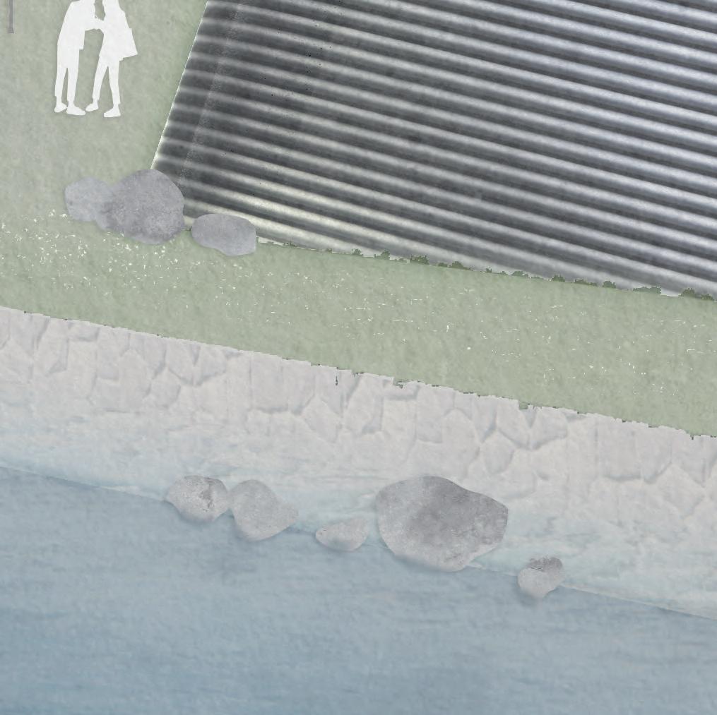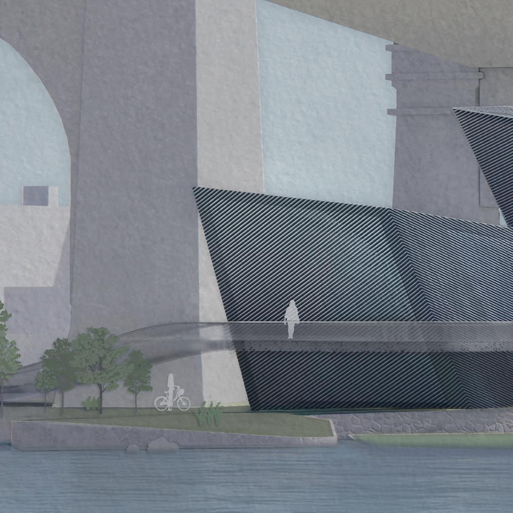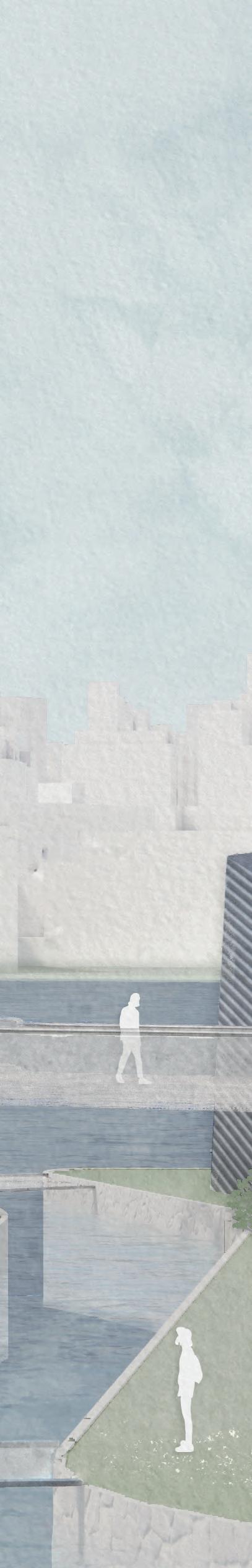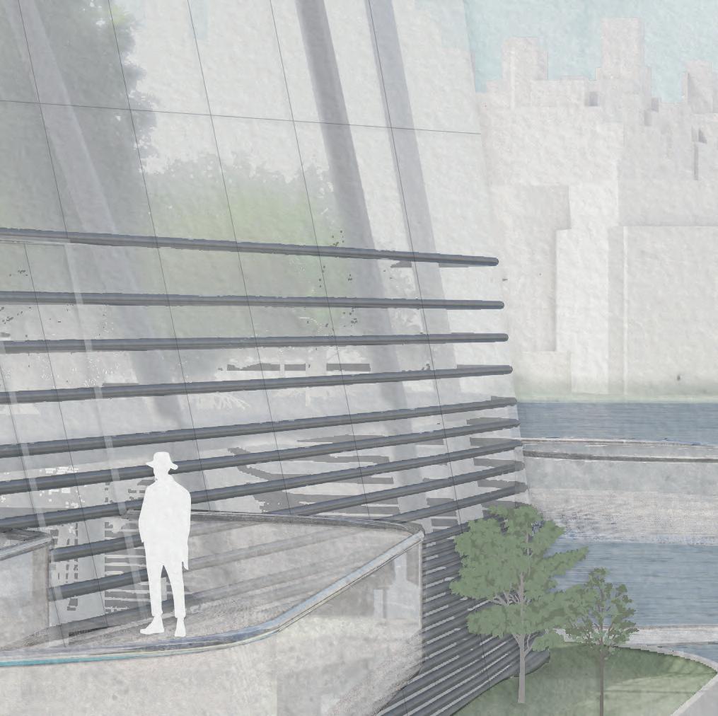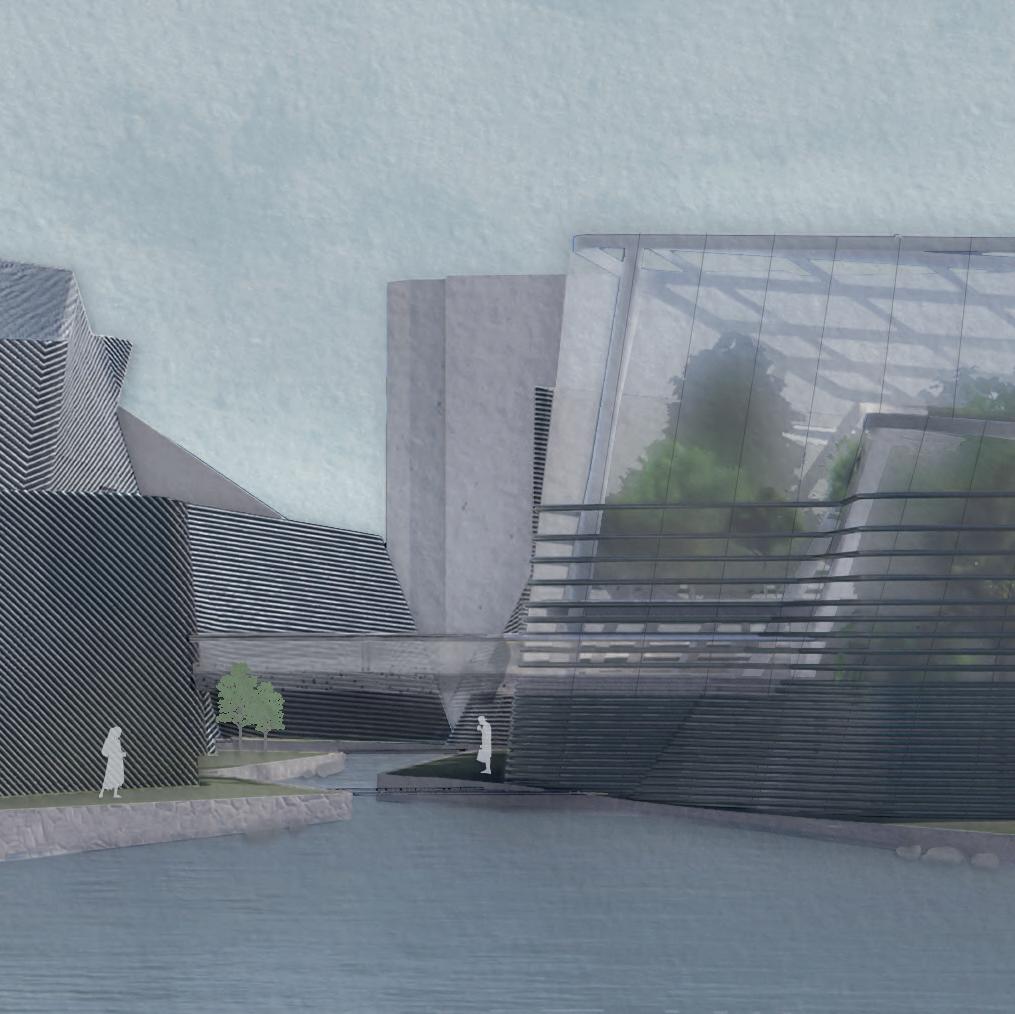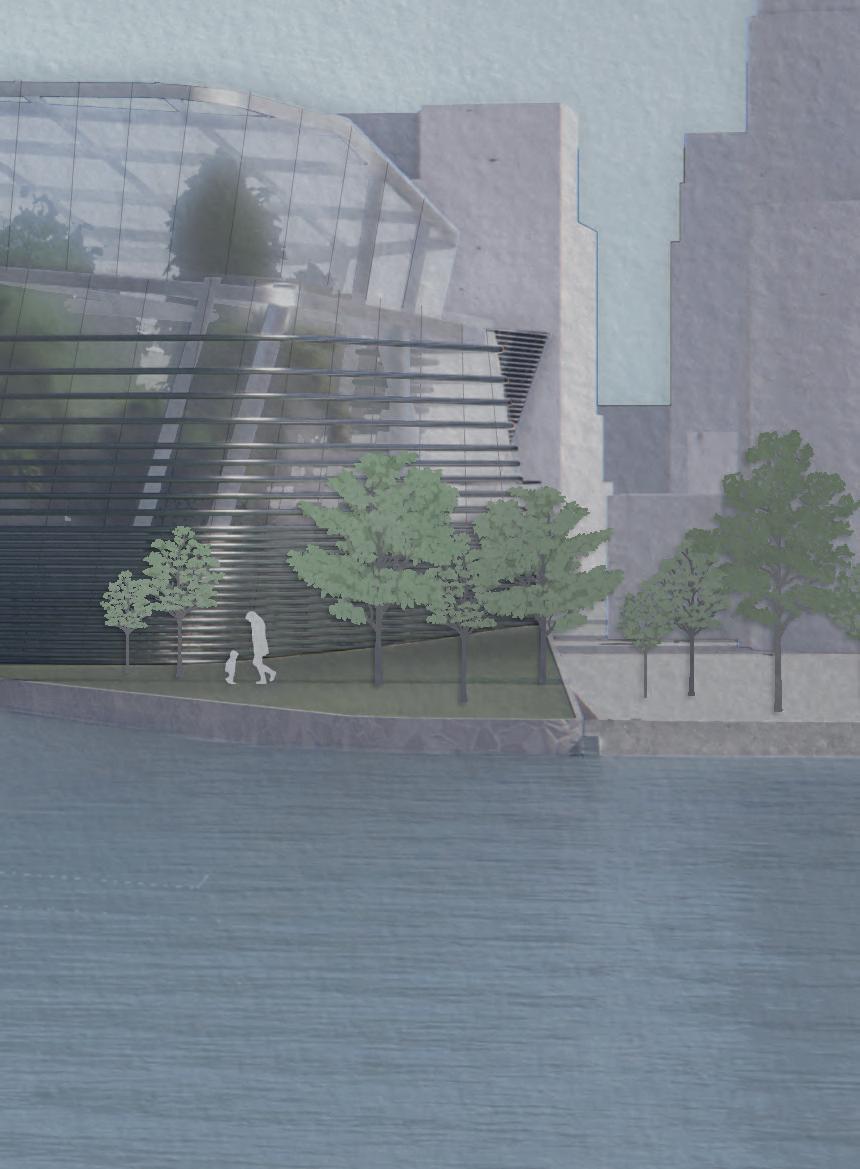 This idea of grounded sustainability and machine processes manifests as pebble-like forms that are both a homage to industrial machinery and a return to our natural landscape. These soft, rounded volumes sit within the landscape as both decorative and functional buildings. There is a contrast between the natural landscape and man-made infrastructure throughout the proposal, with water even becoming part of the main design concept. The concept of fl ow is central to the design, but this is drawing inspiration from both the idea of fl ow throughout processes and the gradual fl owing of water.The water within the landscape varies depending on the time of day, as it is aff ected by the tide.The water then becomes a mediator between the architectural design and the East River. This concept is echoed in the façade, which incorporates fl owing pipes as both opaque walls and shading devices. Finally, a rippling walkway leads visitors deeper into the site from the adjacent park and invites people to discover what activities are hosted by the peaceful pebble forms. Work included are the drawings and visuals I developed as part of a collaborative design and working process.