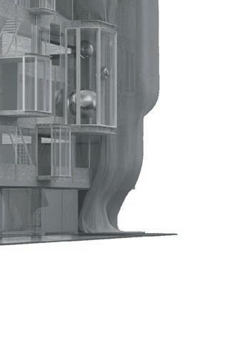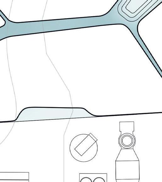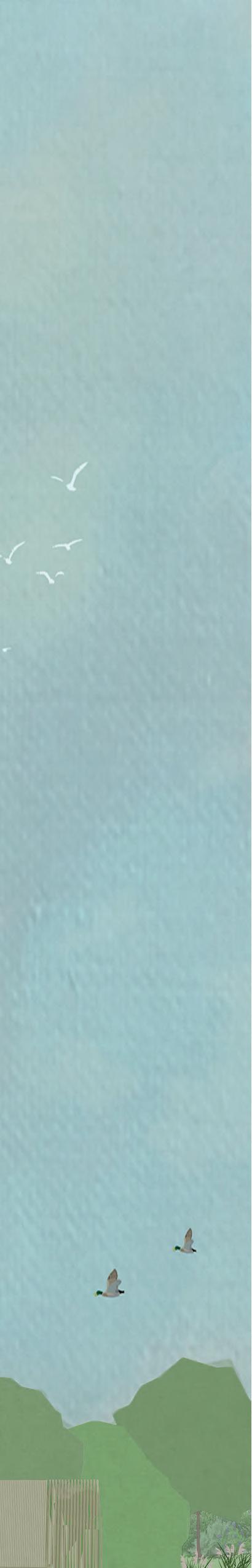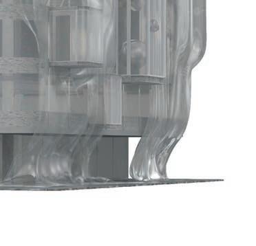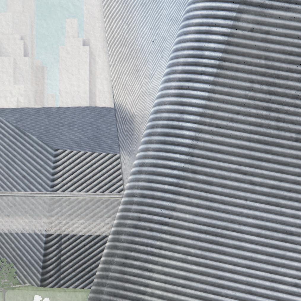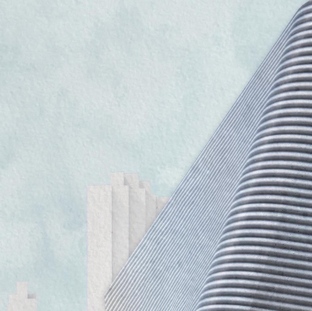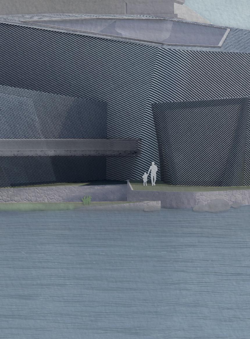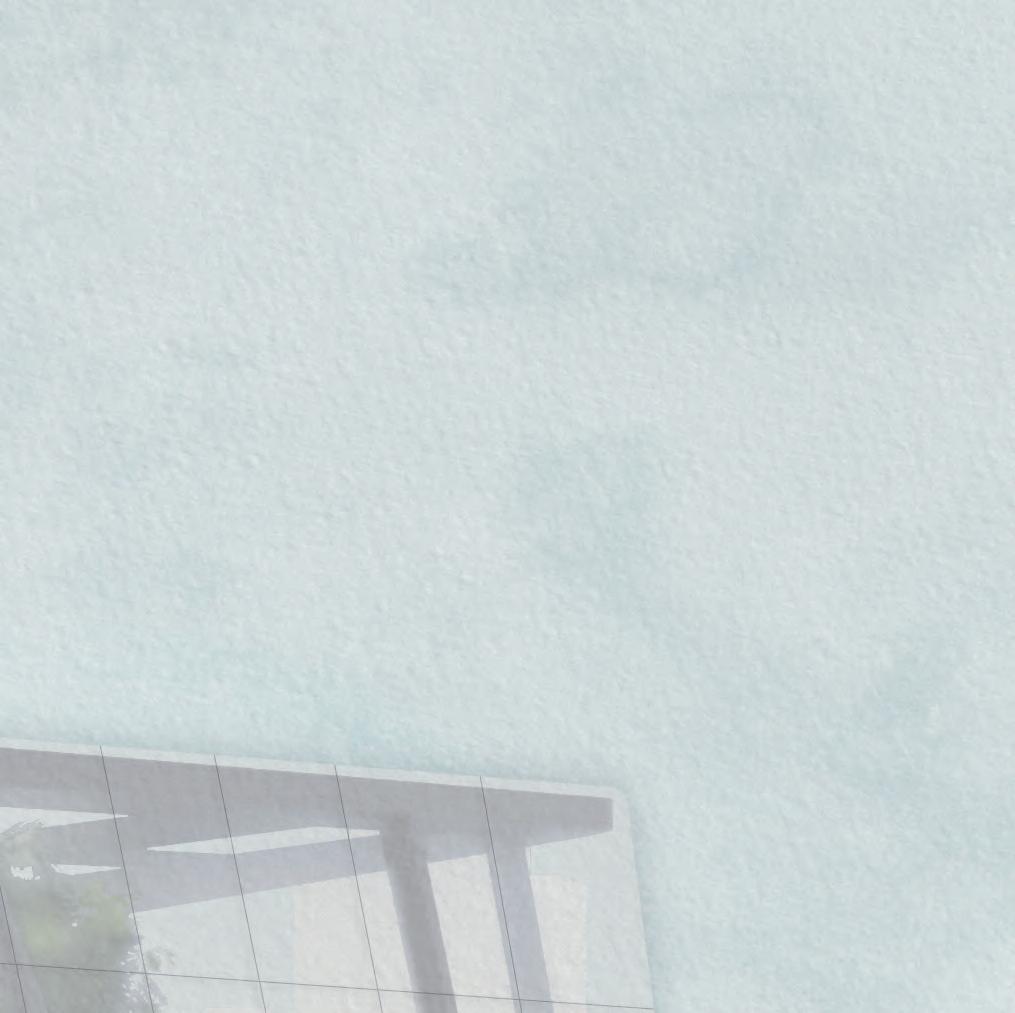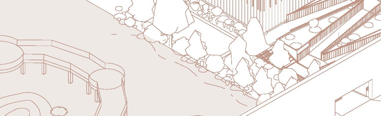This idea of grounded sustainability and machine processes manifests as pebble-like forms that are both a homage to industrial machinery and a return to our natural landscape. These soft, rounded volumes sit within the landscape as both decorative and functional buildings. There is a contrast between the natural landscape and man-made infrastructure throughout the proposal, with water even becoming part of the main design concept. The concept of fl ow is central to the design, but this is drawing inspiration from both the idea of fl ow throughout processes and the gradual fl owing of water.The water within the landscape varies depending on the time of day, as it is aff ected by the tide.The water then becomes a mediator between the architectural design and the East River. This concept is echoed in the façade, which incorporates fl owing pipes as both opaque walls and shading devices. Finally, a rippling walkway leads visitors deeper into the site from the adjacent park and invites people to discover what activities are hosted by the peaceful pebble forms. Work included are the drawings and visuals I developed as part of a collaborative design and working process.