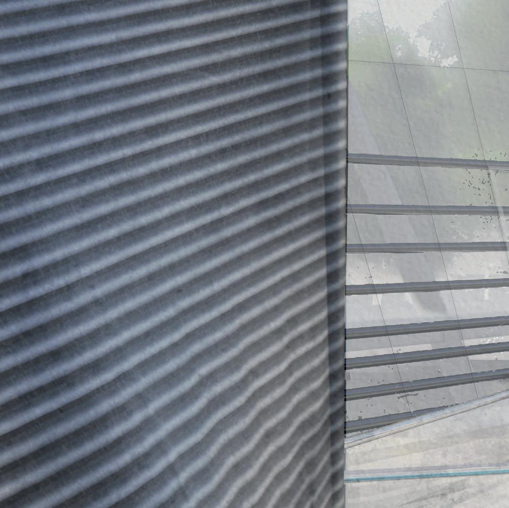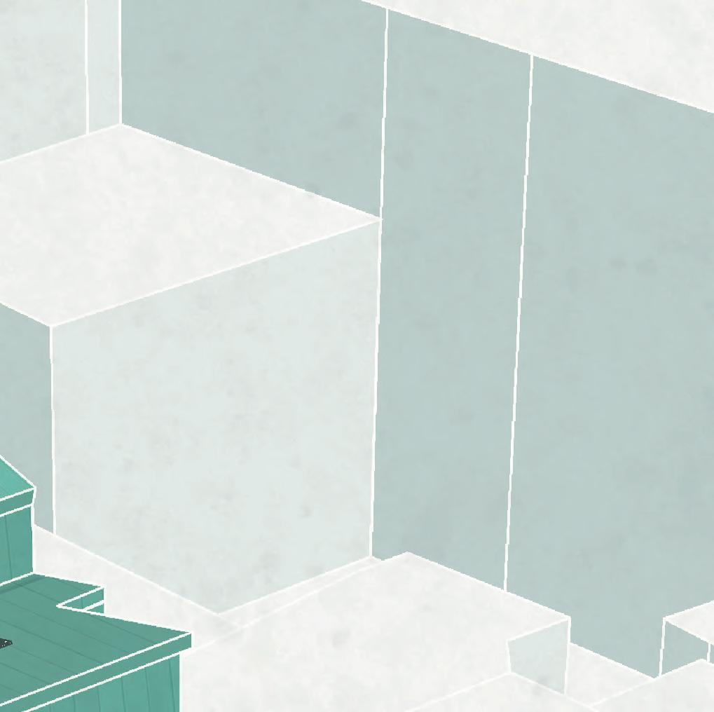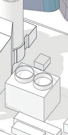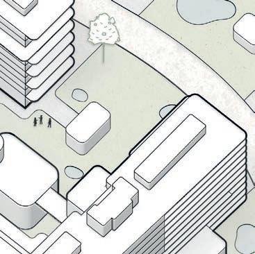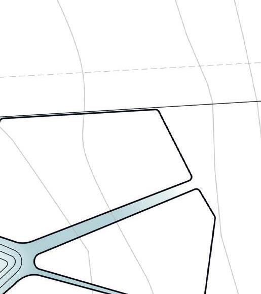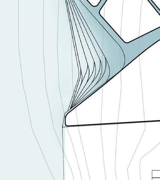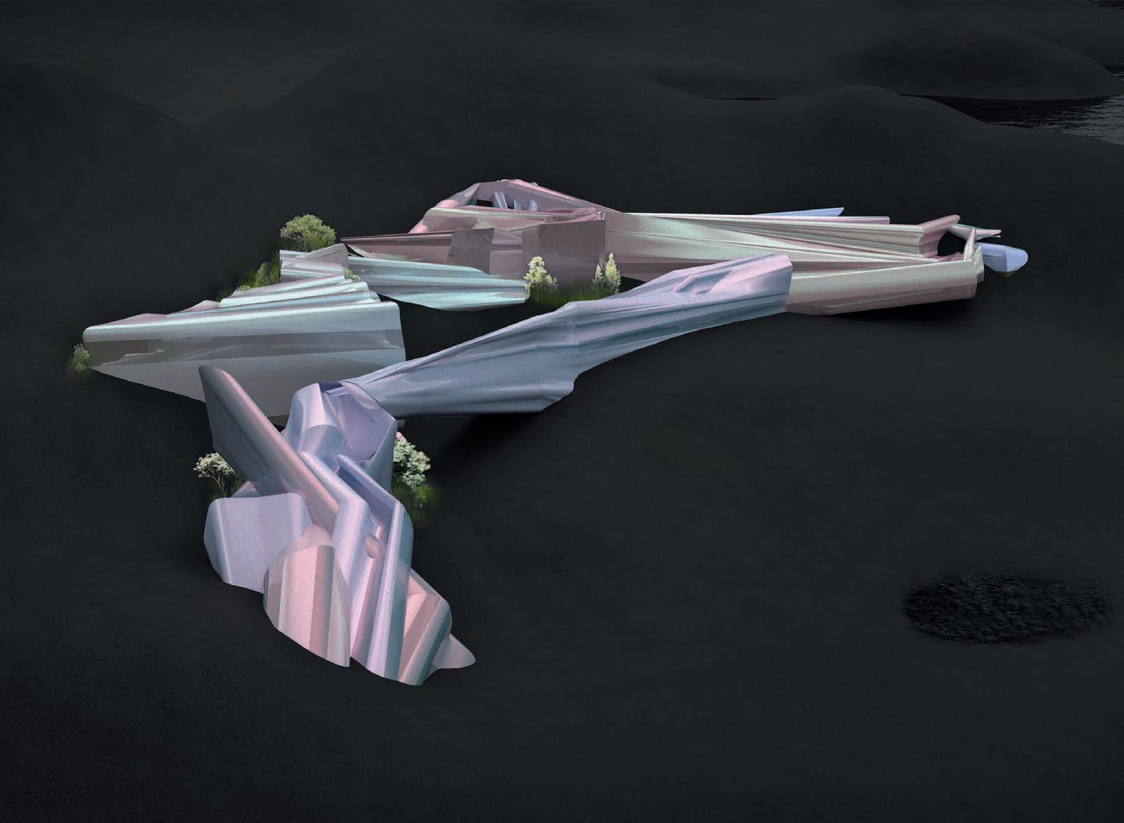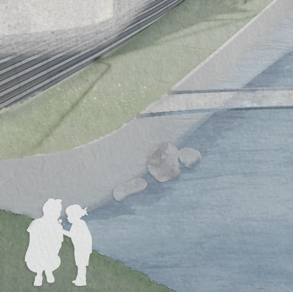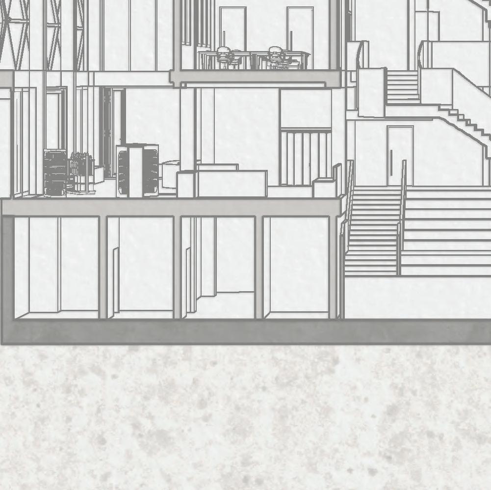 This idea of grounded sustainability and machine processes manifests as pebble-like forms that are both a homage to industrial machinery and a return to our natural landscape. These soft, rounded volumes sit within the landscape as both decorative and functional buildings. There is a contrast between the natural landscape and man-made infrastructure throughout the proposal, with water even becoming part of the main design concept. The concept of fl ow is central to the design, but this is drawing inspiration from both the idea of fl ow throughout processes and the gradual fl owing of water.The water within the landscape varies depending on the time of day, as it is aff ected by the tide.The water then becomes a mediator between the architectural design and the East River. This concept is echoed in the façade, which incorporates fl owing pipes as both opaque walls and shading devices. Finally, a rippling walkway leads visitors deeper into the site from the adjacent park and invites people to discover what activities are hosted by the peaceful pebble forms. Work included are the drawings and visuals I developed as part of a collaborative design and working process.