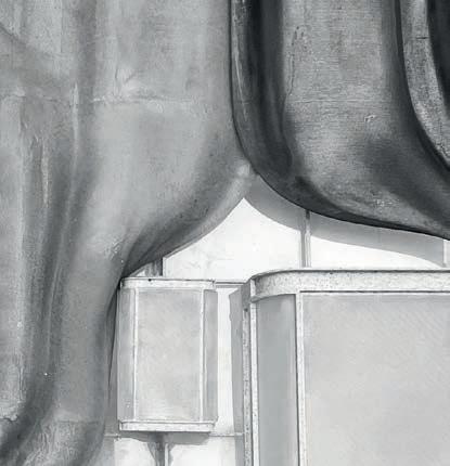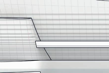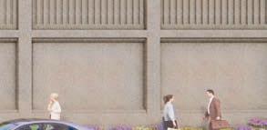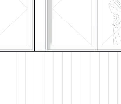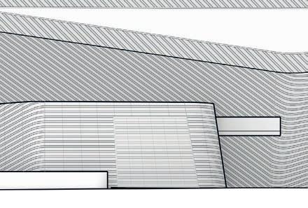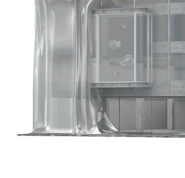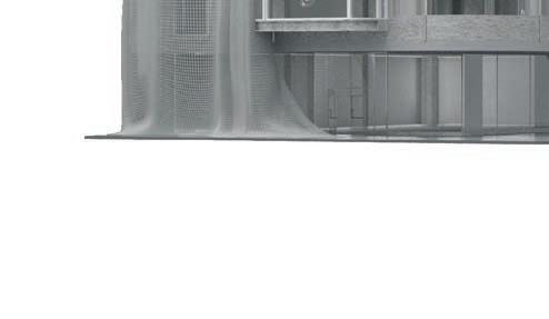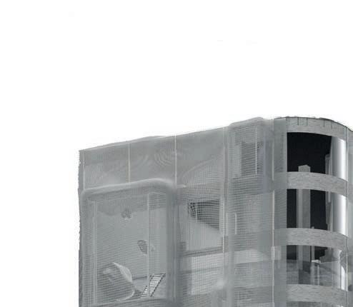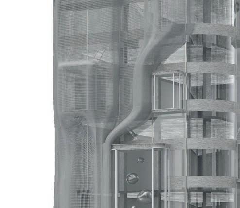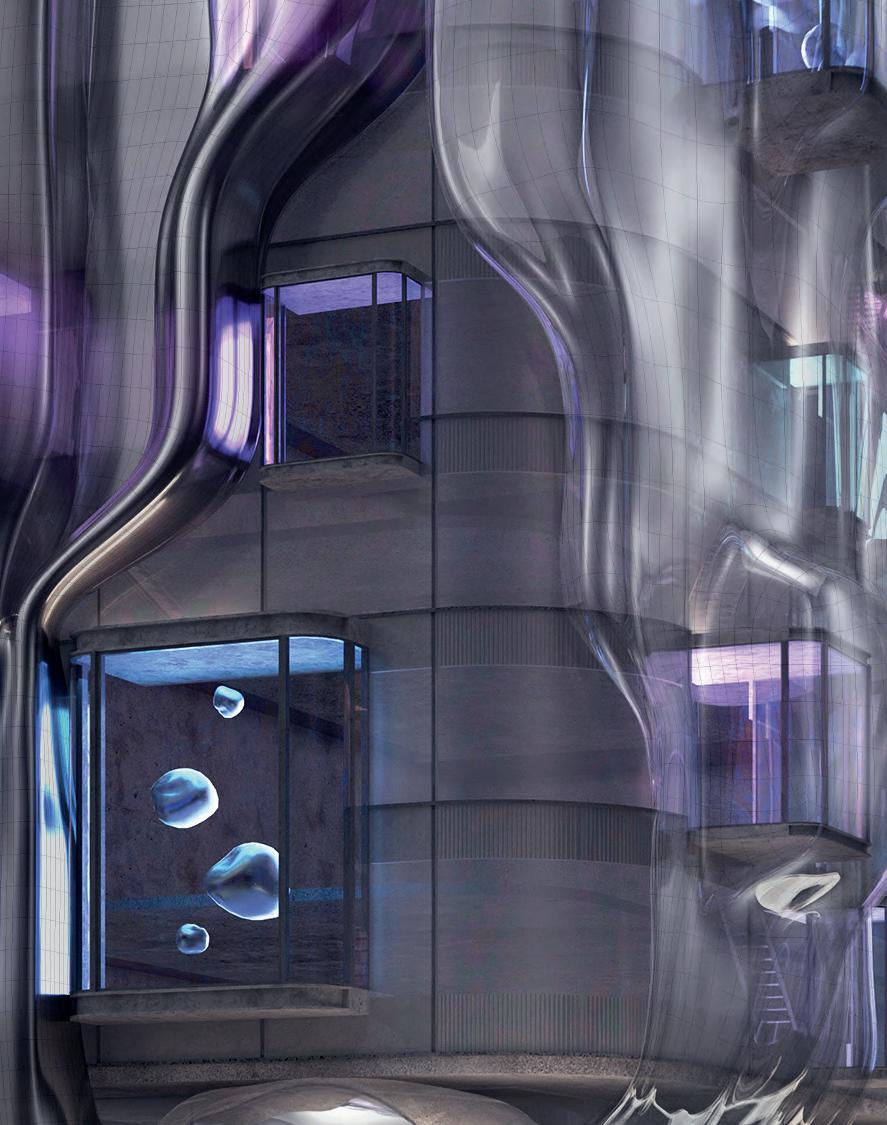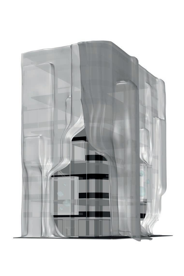 Contrast and layering in these images display the façade as a device for igniting curiosity about what is contained within the building. Inside is a dynamic, multi level retail and concept store where creators from various creative fields can come together to showcase their work in an ever-changing landscape of experiential installations. The exterior responds to this environment by revealing glimpses of the vibrant interior through strategic openings and materiality that frame curated display moments. The existing concrete structure is draped in a clear, softly distorted skin. These two materialities are in deliberate opposition: heavy versus light, fixed versus seemingly fluid. The soft fabric-like façade follows the form of bay windows, which shift in and out of the building’s skin and serve as display opportunities. The secondary sheer façade varies in opacity and reflectivity to catch the light differently throughout the day while revealing selected interior spaces.