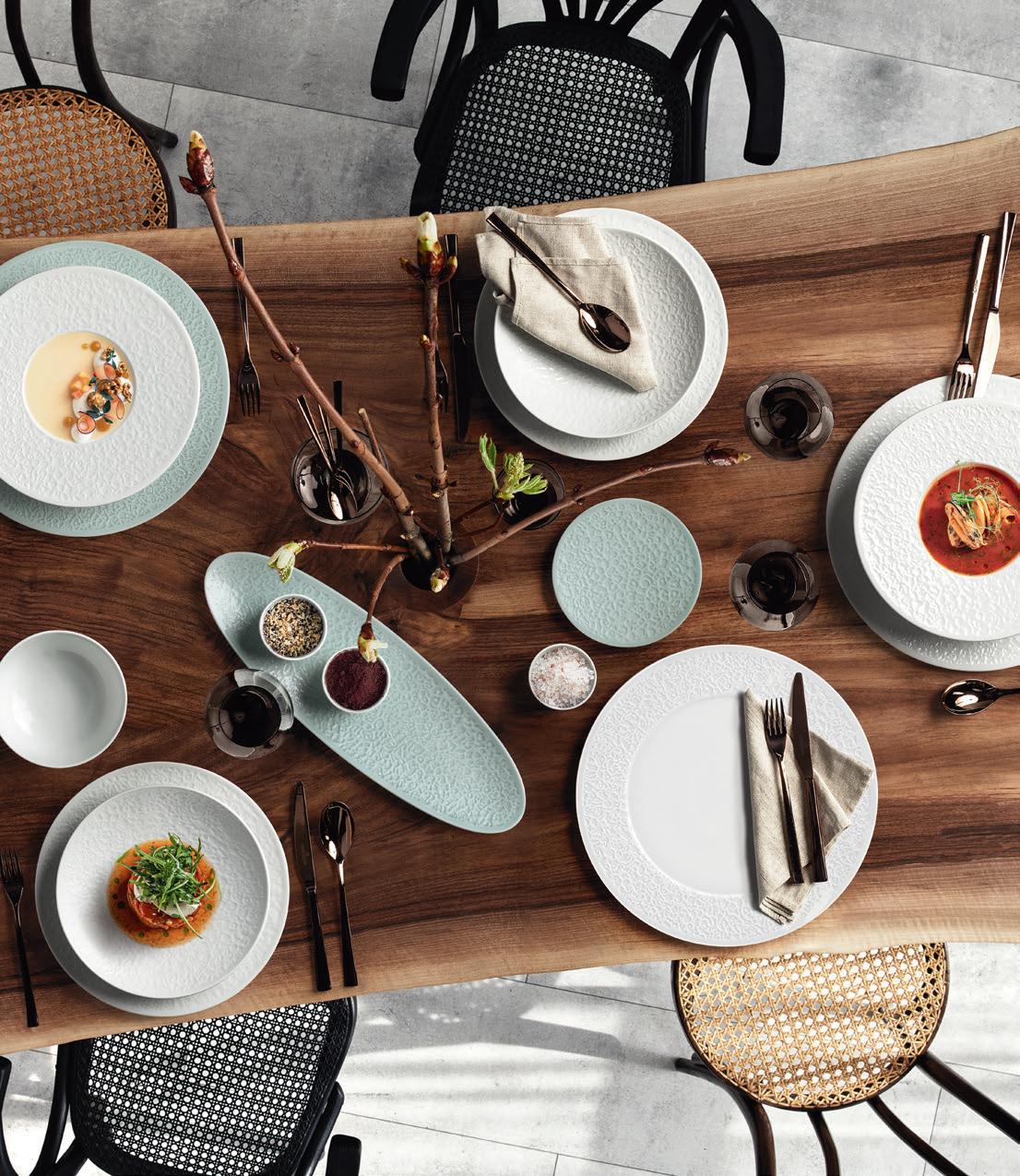 SENTO Aura is available in the colors »White«, »Beige« and »Mint« with its unique feel. The surface of the individual tableware items feels smooth while the fine speckles provide a noticeable texture. These tiny, slightly raised particles create subtle accents that can be felt under the fingertips and give the material a special depth.