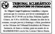 Semanario Arquidiocesano de Guadalajara Órgano de Formación e Información Católica Semanario Arquidiocesano de Guadalajara, fundado por el Sr. Cardenal Dn. Juan Sandoval Íñiguez, el 24 de enero de 1997 Registrado ante la Comisión Calificadora de Publicaciones y Revistas Ilustradas —CCPRI— en Certificados de Licitud de Título y Contenido números 10296 y 7226 expediente 1/432“97”/13565 el 20 de enero de 1998 y en el Instituto Nacional de Derecho de Autor, bajo reserva al uso exclusivo del título 04-2011-070709061600-101 el 7 de julio de 2011 Registro Postal Publicación Periódica PP14-0002-2000, autorización por SEPOMEX No se devuelven originales. Los escritos firmados son responsabilidad del autor, no de la publicación ni del titular Es una publicación editada por Creator Comunicación, S. de RL. de CV., con oficinas y redacción en Isla Flores No. 3344-2, Col. Jardines de San José, Guadalajara, Jal., México, C.P. 44950 A.P. 3-31. Teléfono: 3002-6470. Suscripciones ext. 1953 | Publicidad ext. 1925 | Redacción ext. 1922 Horario de oficina: 8:30 am. a 5:30 pm., correo electrónico: semanario@cccomunicaciones.com.mx