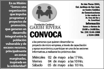 El Equipo Diocesano de Planificación Natural de la Familia con el Método de la Ovulación Billings (MOB) ofrece los siguientes Cursos: el 13 de abril, en el Salón de la Casa Pastoral “San Cristóbal Magallanes”, de la Parroquia Virgen de Guadalupe Madre de los Mexicanos (José López Portillo 255), a las 20 Hrs.; el lunes 16, en San Pascual Bailón (Av. Las Rosas 128, Col. La Guadalupana), comienza a las 20 horas; en Madre de Dios (Av. Providencia 2954, Providencia), el 23 de abril a las 20 Hrs. El Curso consta de 8 sesiones de 2 horas c/u, una por semana. Más información, al Tel. 3645-2042.