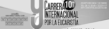 Bajo el lema “Por la paz somos campeones en la vida”, se realizará la 9ª Carrera Internacional por la Eucaristía el 13 de mayo. Hay categorías para toda la familia. Mayores informes e inscripciones, a los Tels. 36133085 y 3333-1117. Página Web: www. carreraporlaeucaristia.com