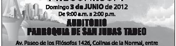La Pastoral Bíblica llama a todos los Agentes de las Escuelas Bíblicas Parroquiales, a participar en el próximo Encuentro, el 10 de junio, en las instalaciones del Instituto Bíblico (Av. de la Paz 1665), de las 10 a las 13.30 Hrs. Informes, al 3121-0395. La Sección de los Derechos Humanos Diocesanos ofrece, a Sacerdotes y Laicos Coordinadores de alguna Pastoral, material sobre los Talleres Círculos de la Democracia, propuestos por la Comisión Episcopal para la Pastoral Social y la Conferencia del Episcopado Mexicano. Informes, en Emiliano Zapata 532, entre Industria y Federación, o al Tel. 3618-6846. Bloog: http://derechoshumanosdiocesanosgdl.blogspot.com/.