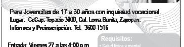 Se hace un llamado a jovencitas de entre 17 y 30 años de edad a vivir una gran experiencia vocacional en el XII Previda Contemplativa del 27 al 29 de julio, en CeCap (Topacio 3000, Loma Bonita, Zapopan). Informes y preinscripción, en el Tel. 3600-1516.