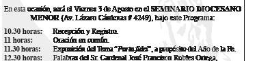 La Comunidad Evangelio y Misión brinda un Retiro de Evangelización del 3 al 5 de agosto, en la Casa Pastoral de Nuestra Sra. del Sagrario (Pedro Loza 995). Ingreso, el viernes 3 a las 16.30 horas. Informes, al 3833-3400.