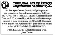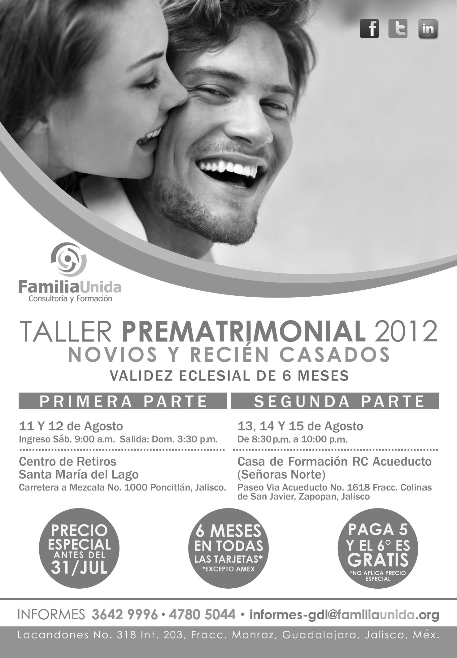 La Parroquia La Guadalupana brinda Pláticas Prematrimoniales en el Anexo a ésta (Francisco de Ayza 2623, entre Lagunitas y Huertas), el último domingo de cada mes, comenzando a las 8.30 Hrs. y saliendo a las 19 Hrs. Es importante la asistencia también de los papás de los novios. Informes, al 3643-8001.