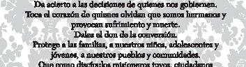 No queremos saber ni queremos descubrir que alguien, encargado de nuestra seguridad, esté aliado con el crimen organizado y estemos así en manos tan inseguras cuanto peligrosas. Con este deseo de que construyamos una Sociedad en paz, armonía, trabajo, tranquilidad, y en coordinación con nuestras Autoridades, invoco para todos la Bendición de Dios Todopoderoso, Padre e Hijo y Espíritu Santo.