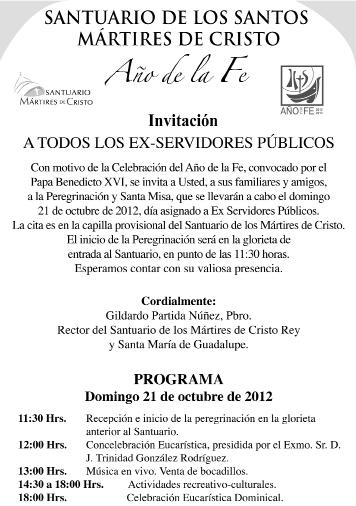 El Departamento de Catequesis Especial, de la Sección Diocesana de Evangelización y Catequesis, convoca a la Peregrinación para personas con discapacidad a la Basílica de Zapopan, el domingo 28 de octubre. Se pide que lleguen a las 9.45 horas en el Arco de entrada a Zapopan (Américas y Ávila Camacho), para de ahí partir rezando el Rosario. Habrá una Eucaristía, con intérpretes de Lengua de Señas Mexicana, a las 11 horas. Se pide asistan vestidos de blanco para rogar a la Virgen por la paz en México.
