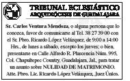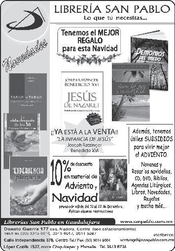 Órgano de Formación e Información Católica Semanario Arquidiocesano de Guadalajara, fundado por el Sr. Cardenal Dn. Juan Sandoval Íñiguez, el 24 de enero de 1997 Registrado ante la Comisión Calificadora de Publicaciones y Revistas Ilustradas —CCPRI— en Certificados de Licitud de Título y Contenido números 10296 y 7226 expediente 1/432“97”/13565 el 20 de enero de 1998 y en el Instituto Nacional de Derecho de Autor, bajo reserva al uso exclusivo del título 04-2011-070709061600-101 el 7 de julio de 2011 Registro Postal Publicación Periódica PP14-0002-2000, autorización por SEPOMEX No se devuelven originales. Los escritos firmados son responsabilidad del autor, no de la publicación ni del titular Es una publicación editada por Creator Comunicación, S. de RL. de CV., con oficinas y redacción en Isla Flores No. 3344-2, Col. Jardines de San José, Guadalajara, Jal., México, C.P. 44950 A.P. 3-31. Teléfono: 3002-6470. Suscripciones ext. 1953 | Publicidad ext. 1925 Redacción ext. 1922 Horario de oficina: 8:30 am. a 5:30 pm., correo electrónico: semanario@cccomunicaciones.com.mx Página Internet: http://www.semanario.com.mx • Distribución: Mensajería Tercer Milenio, Jarauta No. 510-A, Tels. 3618-9670, planta alta. Guadalajara, Jal. C.P. 44360