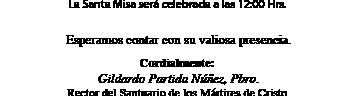las 19 Hrs. Es importante la asistencia también de los papás de los novios. Informes, al 3643-8001.