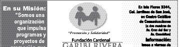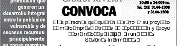La Fundación Cardenal Garibi Rivera impulsa Programas y Proyectos de Promoción que generen un desarrollo integral entre la población vulnerable, inspirada en la solidaridad, y convoca a las personas que quieran desarrollar su Proyecto de Micro-empresa, a través de capacitación y apoyo económico, a participar en una de las Sesiones Informativas los días: viernes 11 y sábado 12, a las 10 Hrs., en Isla Flores 3344, Jardines de San José (a dos cuadras de la esquina de Av. Cruz del Sur y Av. Conchita). Informes, a los Tels. 3144-1906 y 3144-1908.