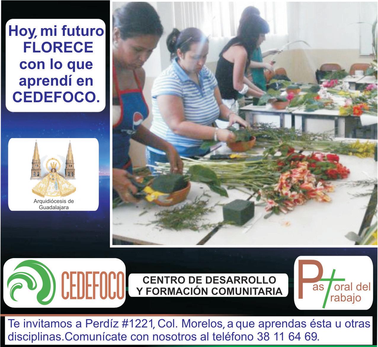 Talleres, Cursos y Servicios de Salud y Catequesis para personas con alguna discapacidad. Todo, con el objetivo de colaborar a la superación personal de los Trabajadores y las comunidades. CEDEFOCO está ubicado en la Calle Perdiz 1221, entre Cardenal y 2 de Abril, en la Colonia Morelos. Informes, al 38116469.