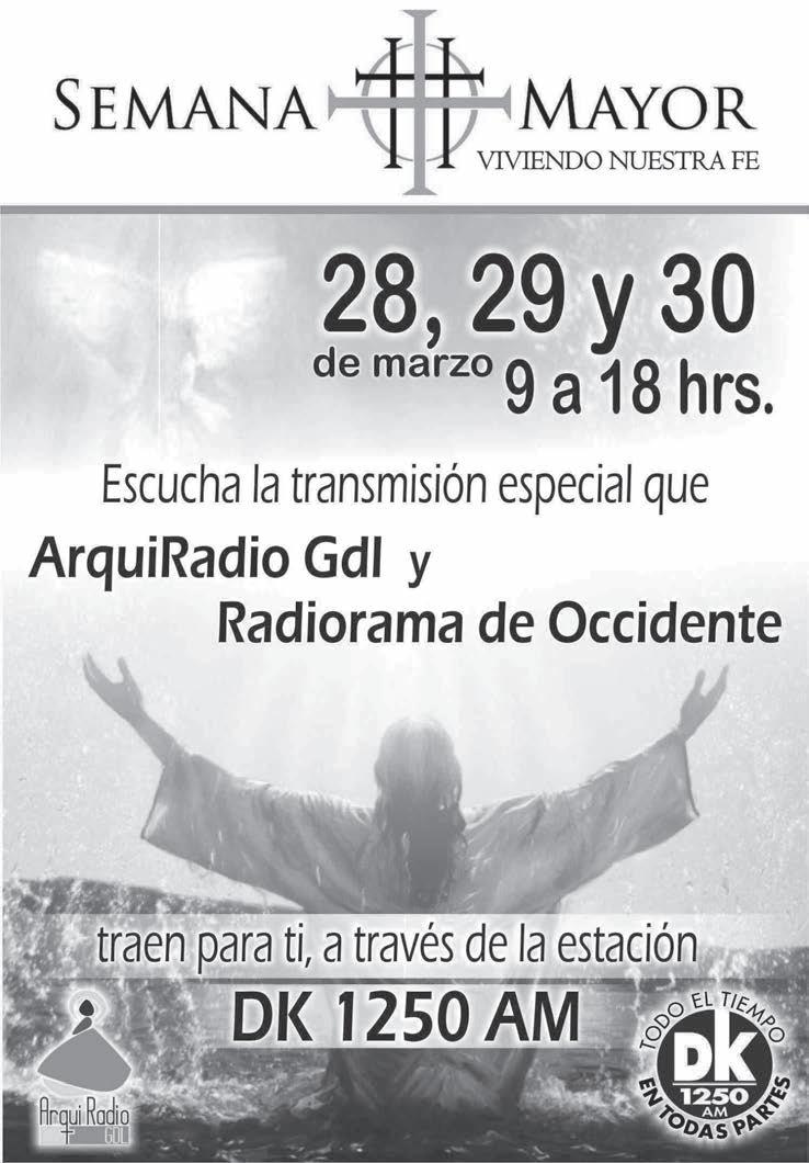 Semanario Arquidiocesano de Guadalajara ❙ Órgano de Formación e Información Católica ❙ Semanario Arquidiocesano de Guadalajara, fundado por el Sr. Cardenal Dn. Juan Sandoval Íñiguez, el 24 de enero de 1997 ❙ Registrado ante la Comisión Calificadora de Publicaciones y Revistas Ilustradas —CCPRI— en Certificados de Licitud de Título y Contenido números 10296 y 7226 expediente 1/432“97”/13565 el 20 de enero de 1998 y en el Instituto Nacional de Derecho de Autor, bajo reserva al uso exclusivo del título 04-2011-070709061600-101 el 7 de julio de 2011 ❙ Registro Postal Publicación Periódica PP14-0002-2000, autorización por SEPOMEX ❙ No se devuelven originales. Los escritos firmados son responsabilidad del autor, no de la publicación ni del titular ❙ Es una publicación editada por Creator Comunicación, S. de RL. de CV., con oficinas y redacción en Isla Flores No. 3344-2, Col. Jardines de San José, Guadalajara, Jal., México, C.P. 44950 A.P. 3-31. Teléfono: 3002-6470. Suscripciones ext. 1953 | Publicidad ext. 1925 Redacción ext. 1922 Horario de oficina: 8:30 am. a 5:30 pm., correo electrónico: semanario@cccomunicaciones.com.mx