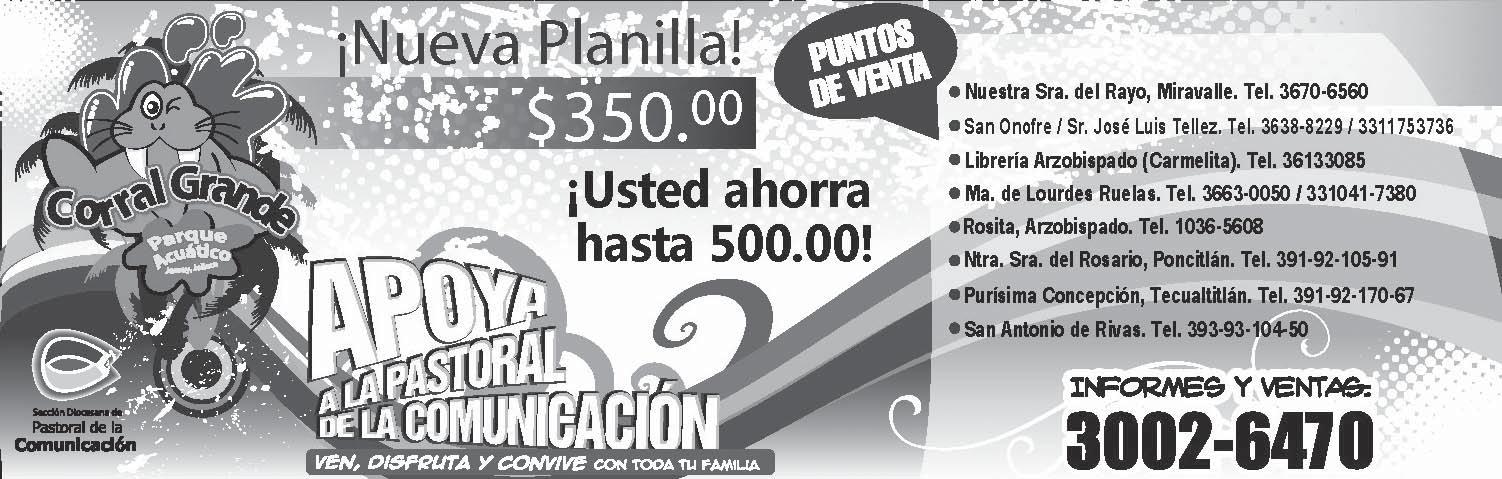 Órgano de Formación e Información Católica Semanario Arquidiocesano de Guadalajara, fundado por el Sr. Cardenal Dn. Juan Sandoval Íñiguez, el 24 de enero de 1997 Registrado ante la Comisión Calificadora de Publicaciones y Revistas Ilustradas —CCPRI— en Certificados de Licitud de Título y Contenido números 10296 y 7226 expediente 1/432“97”/13565 el 20 de enero de 1998 y en el Instituto Nacional de Derecho de Autor, bajo reserva al uso exclusivo del título 04-2011-070709061600-101 el 7 de julio de 2011 Registro Postal Publicación Periódica PP14-0002-2000, autorización por SEPOMEX No se devuelven originales. Los escritos firmados son responsabilidad del autor, no de la publicación ni del titular Es una publicación editada por Creator Comunicación, S. de RL. de CV., con oficinas y redacción en Isla Flores No. 3344-2, Col. Jardines de San José, Guadalajara, Jal., México, C.P. 44950 A.P. 3-31. Teléfono: 3002-6470. Suscripciones ext. 1953 | Publicidad ext. 1925 | Redacción ext. 1922 Horario de oficina: 8:30 am. a 5:30 pm., correo electrónico: semanario@cccomunicaciones.com.mx