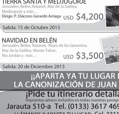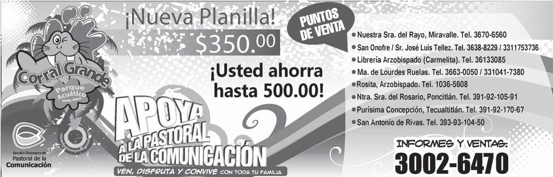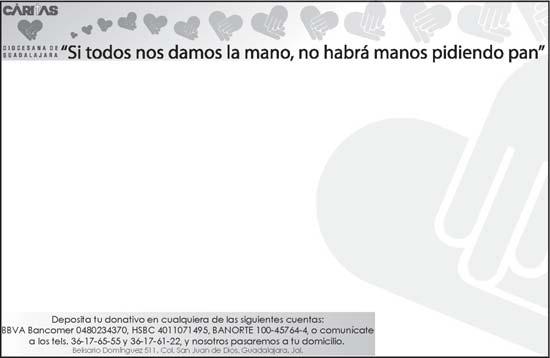 Órgano de Formación e Información Católica Semanario Arquidiocesano de Guadalajara, fundado por el Sr. Cardenal Dn. Juan Sandoval Íñiguez, el 24 de enero de 1997 Registrado ante la Comisión Calificadora de Publicaciones y Revistas Ilustradas —CCPRI— en Certificados de Licitud de Título y Contenido números 10296 y 7226 expediente 1/432“97”/13565 el 20 de enero de 1998 y en el Instituto Nacional de Derecho de Autor, bajo reserva al uso exclusivo del título 04-2011-070709061600-101 el 7 de julio de 2011 Registro Postal Publicación Periódica PP14-0002-2000, autorización por SEPOMEX No se devuelven originales. Los escritos firmados son responsabilidad del autor, no de la publicación ni del titular Es una publicación editada por Creator Comunicación, S. de RL. de CV., con oficinas y redacción en Isla Flores No. 3344-2, Col. Jardines de San José, Guadalajara, Jal., México, C.P. 44950 A.P. 3-31. Teléfono: 3002-6470. Suscripciones ext. 1953 | Publicidad ext. 1925 | Redacción ext. 1922