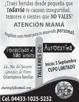 30 de Agosto: “Aprende a comunicarte efectivamente”. De 7.30 a 9 PM, en la Unidad Médica ABVA (Av. de los Maestros 311. Col. Alcalde Barranquitas). Costo: $140 ó $100 (pago anticipado). Expositores: Psic. M. E. Georgina de León Figueroa y Psic. Juan Francisco Campos Alfaro. Informes e inscripciones: 33-38-42-34-84 ó 33-3467-41-71