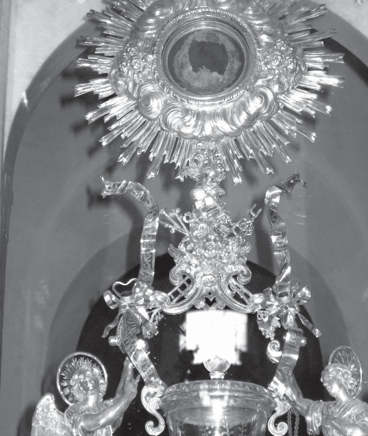 Viajé a Lanciano para presentar el milagro por televisión; entré a la iglesia de San Francisco, de los Frailes Menores, me dirigí al altar principal y me postré de rodillas para estar ante el milagro, expuesto en un hermoso relicario de plata que, a manera de custodia, exhibe la Hostia convertida en carne y, dentro de una ampolla de cristal, cinco glóbulos de sangre, ni seca ni líquida. Miré el milagro y lo adoré. Luego, me acerqué y subí por detrás del retablo hasta quedar muy cerca del relicario. Lo fotografié y lo grabé con nuestras cámaras de televisión, gracias a la bondad de los Frailes.