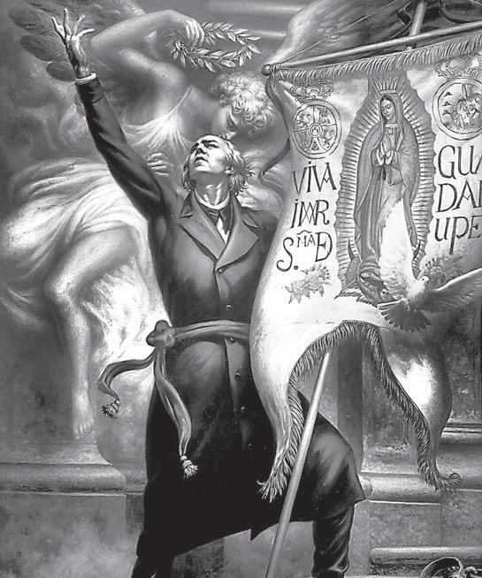 Y, al centro, obviamente, la Evangelizadora de nuestra Patria, Santa María de Guadalupe; la misma que fue invocada por el Cura Miguel Hidalgo para abanderar la Causa de la Libertad de la Nación, y otra vez, un siglo después, aclamada como Protectora de la Fe, lo mismo por parte