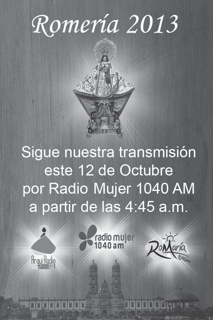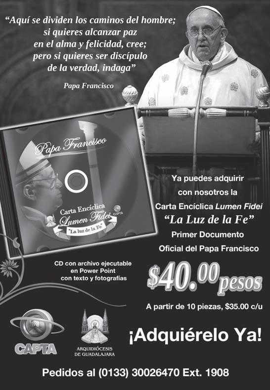 Órgano de Formación e Información Católica Semanario Arquidiocesano de Guadalajara, fundado por el Sr. Cardenal Dn. Juan Sandoval Íñiguez, el 24 de enero de 1997 Registrado ante la Comisión Calificadora de Publicaciones y Revistas Ilustradas —CCPRI— en Certificados de Licitud de Título y Contenido números 10296 y 7226 expediente 1/432“97”/13565 el 20 de enero de 1998 y en el Instituto Nacional de Derecho de Autor, bajo reserva al uso exclusivo del título 04-2011-070709061600-101 el 7 de julio de 2011 Registro Postal Publicación Periódica PP14-0002-2000, autorización por SEPOMEX No se devuelven originales. Los escritos firmados son responsabilidad del autor, no de la publicación ni del titular Es una publicación editada por Creator Comunicación, S. de RL. de CV., con oficinas y redacción en Isla Flores No. 3344-2, Col. Jardines de San José, Guadalajara, Jal., México, C.P. 44950 A.P. 3-31. Teléfono: 3002-6470. Suscripciones ext. 1953 | Publicidad ext. 1925 | Redacción ext. 1922
