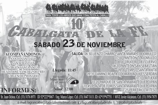 El Movimiento Diocesano “Mulieris Dignitatem” (Dignidad de la Mujer) convoca a hombres y mujeres, mayores de 18 años de edad, a un Retiro del 8 al 10 de noviembre en la Casa Pastoral de San Bernardo (Nicolás Romero 1385). Informes, con Paty Talavera, al 044-33-3948-9371. Asistente Eclesiástico y Fundador del Movimiento, Sr. Canónigo Enrique González Conchas. Encuentros Parroquiales de Conversión Cristiana Católica, y la Parroquia de San Gabriel Arcángel (Glorieta del Charro), con motivo de la Clausura del Año de la Fe, convidan a vivir un Encuentro con Cristo del 15 al 17 de noviembre, para mujeres, y del 22 al 24, para hombres; todos, mayores de 17 años de edad. Mayores informes e inscripciones, al 3605-1090 y 3605-1003. La entrada será a las 17 horas.