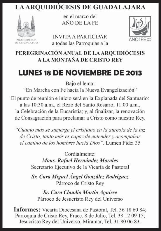 Ofrece a Presbíteros, Religiosos y Laicos de todas las Parroquias, la 8ª Jornada Anual Arquidiocesana, que se llevará a cabo en el Seminario Menor de Guadalajara (Av. Lázaro Cárdenas 4249, Fracc. Camino Real), el sábado 23 de noviembre, de las 9.30 a las 13.30 horas. Más informes, en el Tel. 3646-9338. Convoca el Pbro. Guillermo L.
