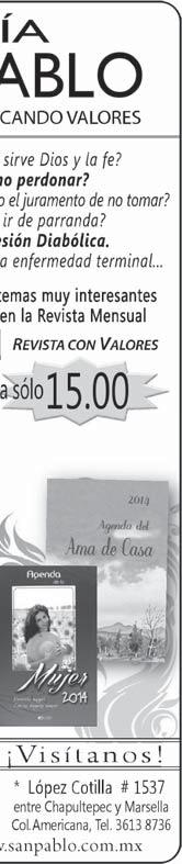 gía actual, entre otros temas, expuestos por Rafael Piña, el Pbro. Eduardo Vargas Flores y el Doctor Alejandro Nava. Para mayores informes, comunicarse al 3628-0352.