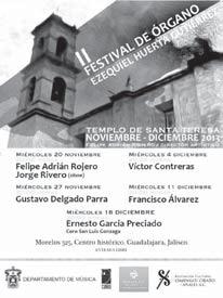 La Escuela Superior Diocesana de Música Sagrada invita al XIV “Festival del Órgano Manuel de Jesús Aréchiga”, in memoriam, que se realizará los jueves del mes de noviembre (21 y 28) en la Catedral Metropolitana, a las 20 Hrs. Se contará con la valiosa participación de los Maestros de Órgano de la Escuela y de la Catedral: Héctor Salcedo, Clemente Quezada, José de Jesús Salcido y Francisco Javier Hernández. El día 28, el Concierto se ofrecerá en homenaje al Maestro Emérito Víctor Manuel Amaral y al Concertista Mtro. Francisco Javier Hernández Vázquez.