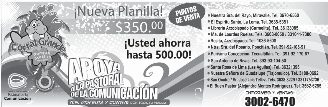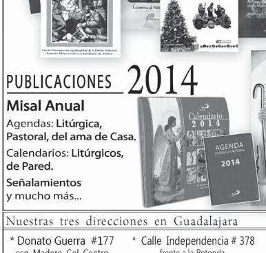 Órgano de Formación e Información Católica Semanario Arquidiocesano de Guadalajara, fundado por el Sr. Cardenal Dn. Juan Sandoval Íñiguez, el 24 de enero de 1997 Registrado ante la Comisión Calificadora de Publicaciones y Revistas Ilustradas —CCPRI— en Certificados de Licitud de Título y Contenido números 10296 y 7226 expediente 1/432“97”/13565 el 20 de enero de 1998 y en el Instituto Nacional de Derecho de Autor, bajo reserva al uso exclusivo del título 04-2011-070709061600-101 el 7 de julio de 2011 Registro Postal Publicación Periódica PP14-0002-2000, autorización por SEPOMEX No se devuelven originales. Los escritos firmados son responsabilidad del autor, no de la publicación ni del titular Es una publicación editada por Creator Comunicación, S. de R.L. de C.V., con oficinas y redacción en Isla Flores N. 3344-2, Col. Jardines de San José, Guadalajara, Jal., México, C.P. 44950 A.P. 3-31. Teléfono: 3002-6470. Suscripciones: Ext. 1953 | Publicidad: Ext. 1925 | Redacción: Ext. 1922 Horario de oficina: 8:30 a.m. a 5:30 p.m., correo electrónico: semanario@cccomunicaciones.com.mx