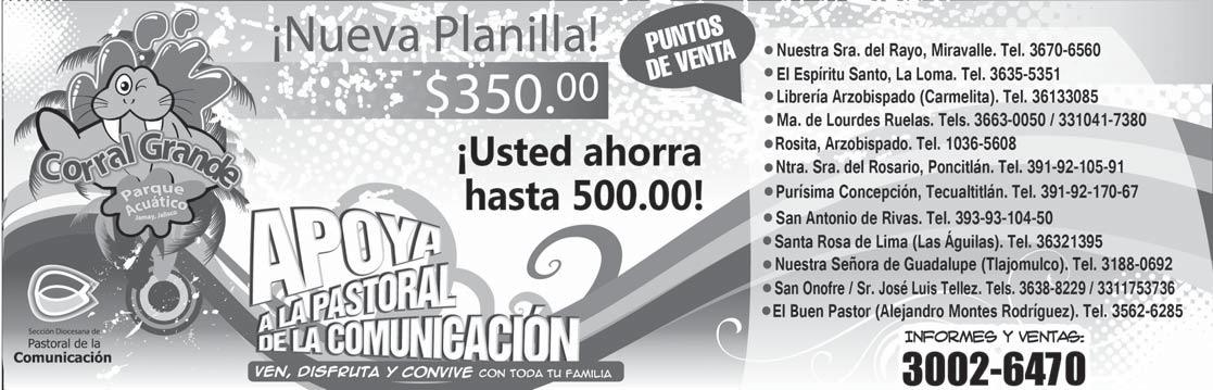 Semanario Arquidiocesano de Guadalajara Órgano de Formación e Información Católica Semanario Arquidiocesano de Guadalajara, fundado por el Sr. Cardenal Dn. Juan Sandoval Íñiguez, el 24 de enero de 1997 Registrado ante la Comisión Calificadora de Publicaciones y Revistas Ilustradas —CCPRI— en Certificados de Licitud de Título y Contenido números 10296 y 7226 expediente 1/432“97”/13565 el 20 de enero de 1998 y en el Instituto Nacional de Derecho de Autor, bajo reserva al uso exclusivo del título 04-2011-070709061600-101 el 7 de julio de 2011 Registro Postal Publicación Periódica PP14-0002-2000, autorización por SEPOMEX No se devuelven originales. Los escritos firmados son responsabilidad del autor, no de la publicación ni del titular Es una publicación editada por Creator Comunicación, S. de R.L. de C.V., con oficinas y redacción en Isla Flores N. 3344-2, Col. Jardines de San José, Guadalajara, Jal., México, C.P. 44950 A.P. 3-31. Teléfono: 3002-6470. Suscripciones: Ext. 1953 | Publicidad: Ext. 1925 | Redacción: Ext. 1922 Horario de oficina: 8:30 a.m. a 5:30 p.m., correo electrónico: semanario@cccomunicaciones.com.mx
