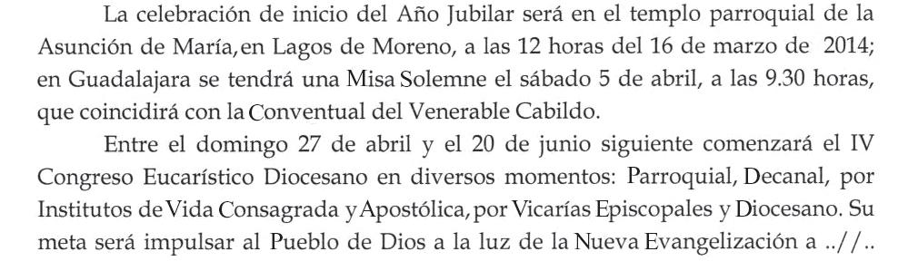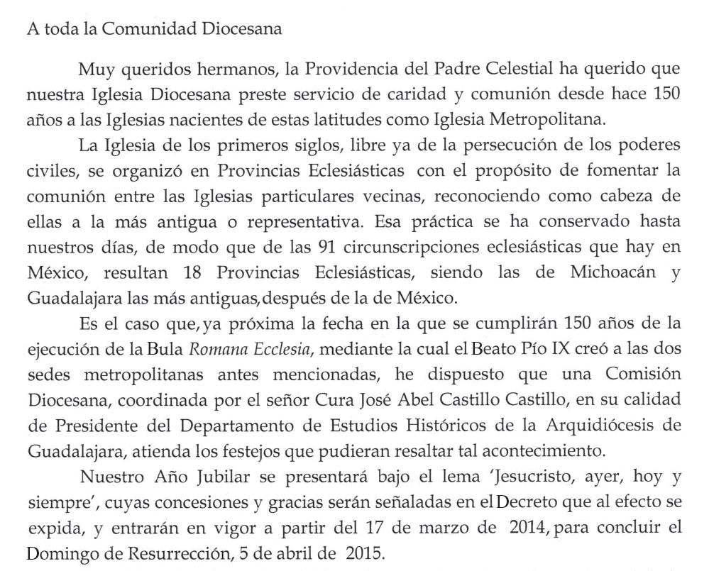 Nuestro Pastor Diocesano reafirma su interés en que celebremos con provecho el Año Jubilar por el Sesquicentenario de la creación de esta Provincia Eclesiástica.