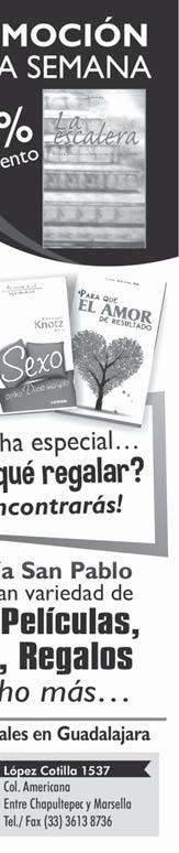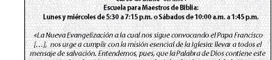 Pastoral Bíblica invita a su Taller “Diferentes métodos de orar con la Palabra”, impartido por el Pbro. Fidel Martínez Ramírez en las instalaciones del Instituto Bíblico Católico (Av. de la Paz 1665, Col. Americana), el 9 de febrero, de las 10 a las 14 horas. Cooperación, de $35. Informes, al 044-33-1289-9633. El Centro Verbo Divino/Librería Verbum invita a la 43ª impartición del Taller “Manejo de Emociones y Relajación”, del 27 al 31 de enero, de las 19 a las 21.30 horas. Será dirigido por el Padre Ranjit Kumar Ekka, SVD. Informes, en el Centro VD (Av. Conchita 4556, Lomas de la Victoria), o al Tel., 3144-3322. “Domus Dei Producciones”, con 24 años de Misión Evangelizadora a través del Teatro, te invita a su primer Taller de “Formación teatral y actoral”. No importa la edad. Mayores informes, al Tel. 3608-1641 y al Cel. 33-1186-5060. Inician en febrero. ¡Súmate a la misión y corre la voz!